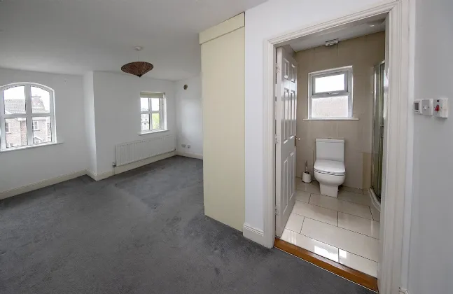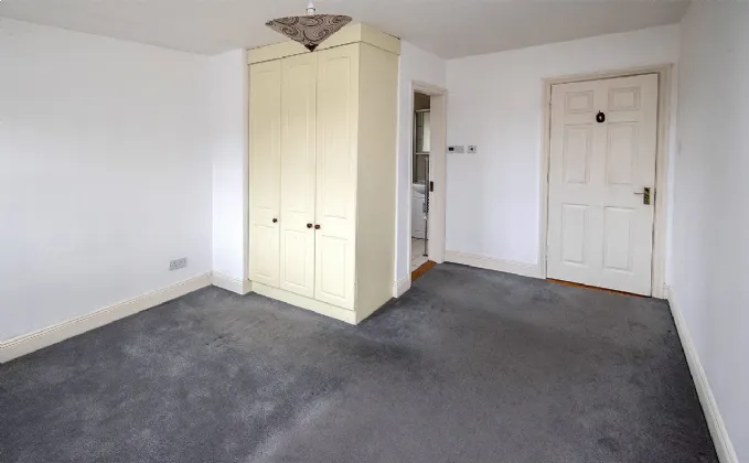 Attic 4.3m x 4.8m Timber floor, walls painted, velux window to the rear, two centre lights, storage presses.