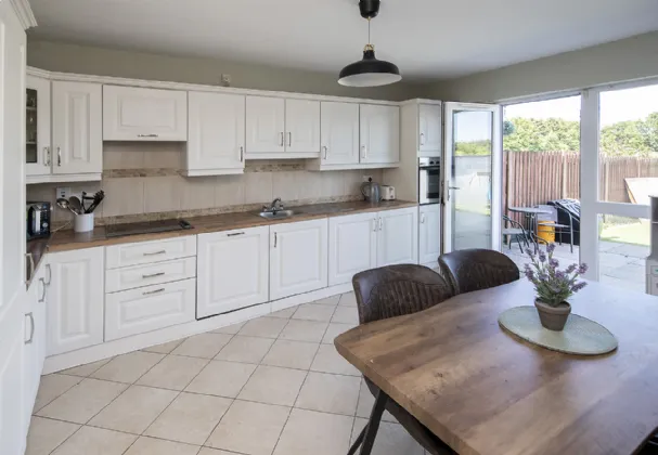 Kitchen/Dining 4.57m x 3.53m Tiled floor, painted walls, window to the rear, door to utility, glass door to the rear garden, centre light, modern fitted kitchen.