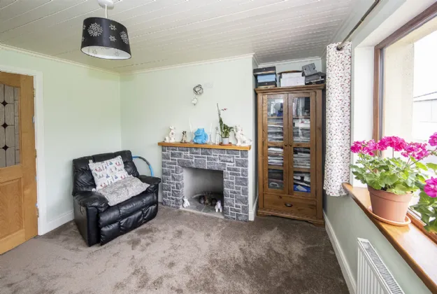 Living Room 2.72m x 4.9m Semi solid timber floor, painted walls, window to the front, curtains, centre light, stove with back boiler.