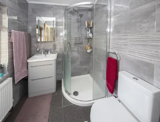Shower Room 1.96m x 1.88m Tiled floor, tiled walls, opaque window to the side, whb with vanity unit, WC, stand alone pressure shower, extractor fan.
