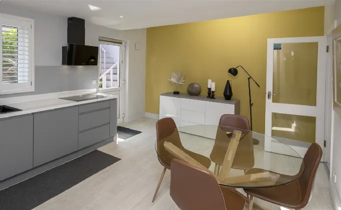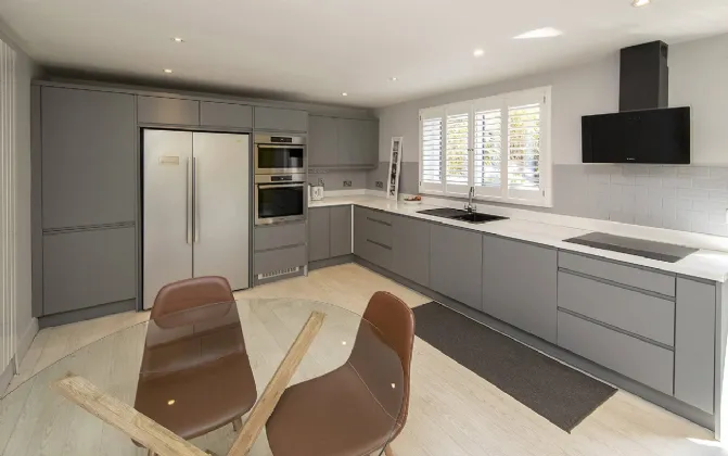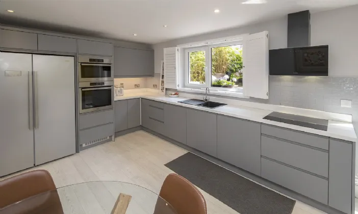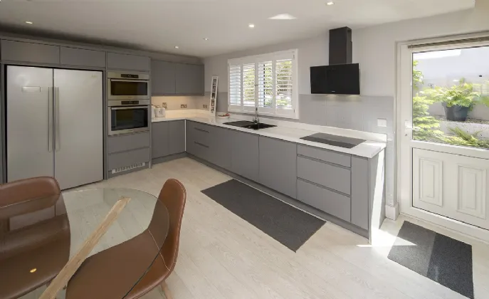 Kitchen /Dining 3.66m x 5.61m Vinyl floor, painted walls, two windows to the rear, blinds, door to the rear garden, spot lights, new contemporary fitted kitchen with integrated appliances i.e, combi oven, American fridge, dishwasher and washing machine.