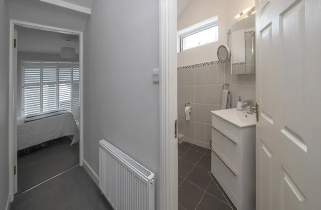 Bathroom/Shower Room 2.5m x 1.65m Tiled floor, tiled walls, window to the side, whb, WC, stand alone shower, centre light.