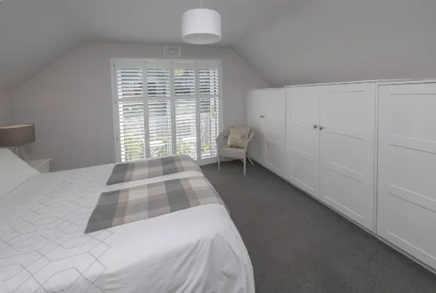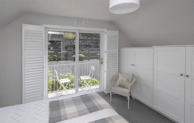 Upstairs, the two bedrooms are of ample size. The second bedroom is to the front and is the full width of the house. The master bedroom is a stunning room with a sliding glass door to the balcony which overlooks the tiered garden below.