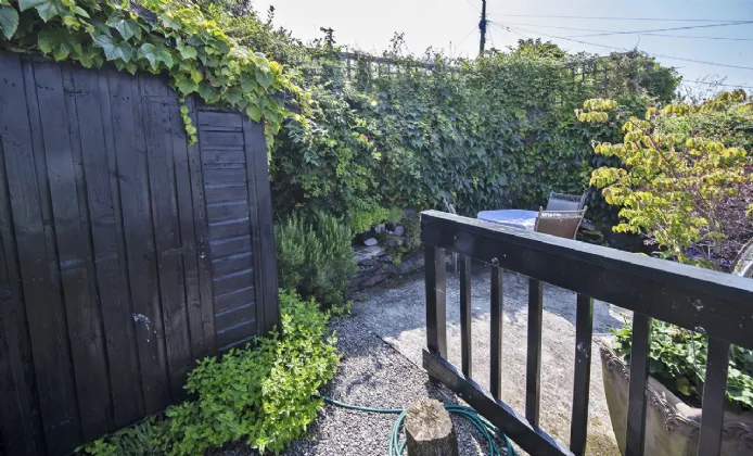 To the rear there is a terraced patio garden with spacious side access, timber shed and picnic area at the top with sea views.