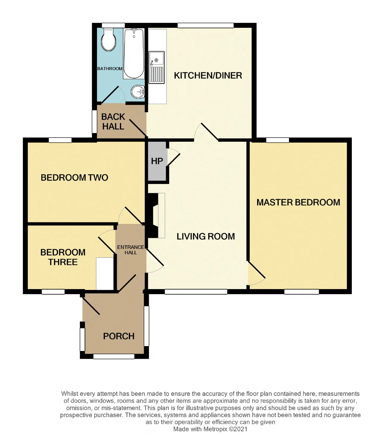 OFCH. Acc: Porch, Ent. hall, kit./dining, living, 3 beds, bath. 68.2 sq.m. (734 sq.ft.) approx.