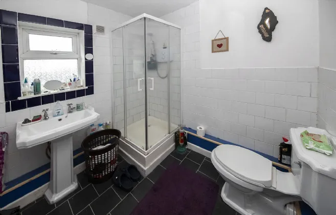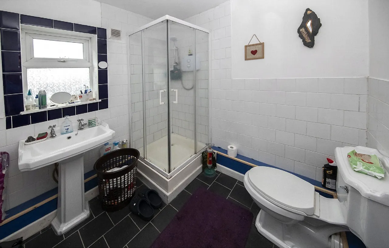Bathroom/Shower Room 2.08m x 2.1m Tiled floor, tiled walls, window to the side, whb, WC, stand alone Triton electric shower, centre light.