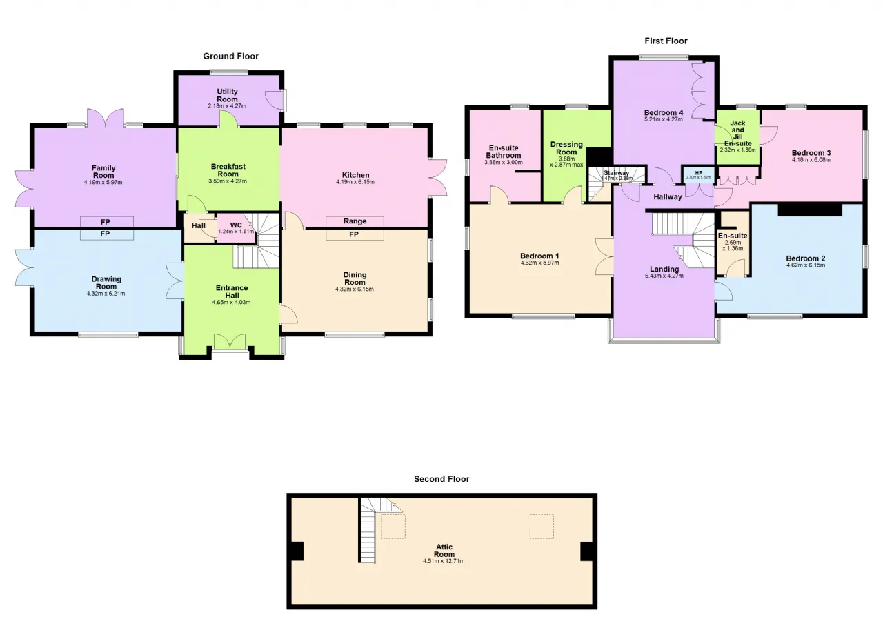 Upstairs, the first-floor landing is enhanced by a striking deep red carpet and incorporates a well-designed home office area, enjoying uninterrupted views across the surrounding countryside. There are four generously sized bedrooms, including an impressive principal suite with a walk-in wardrobe, south-facing aspect and private ensuite. Two further bedrooms share a stylish Jack and Jill ensuite, while the fourth bedroom benefits from dual-aspect windows and its own ensuite.