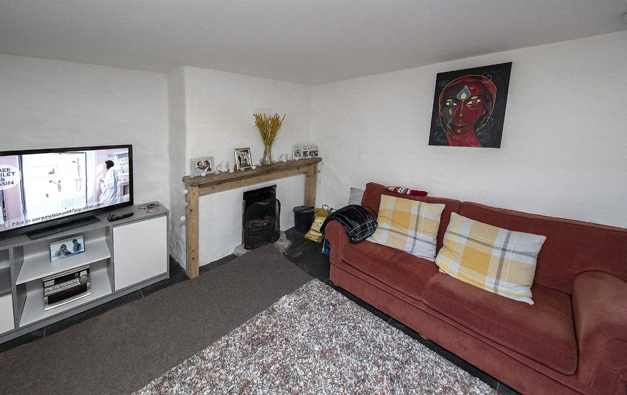 Cosy lounge with exposed stone and open fireplace with back boiler.