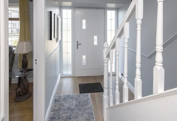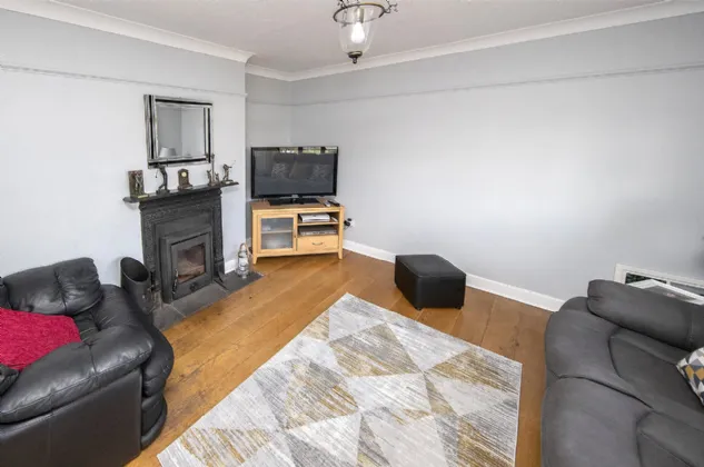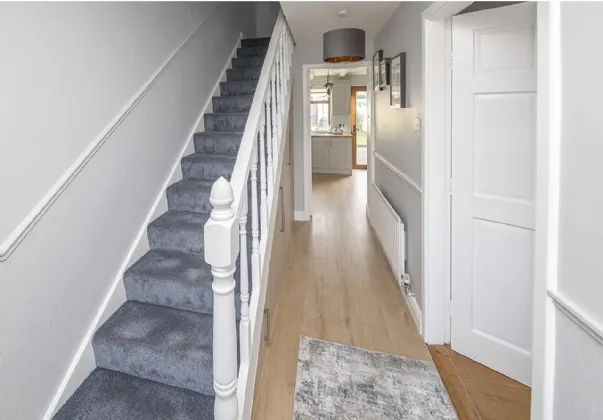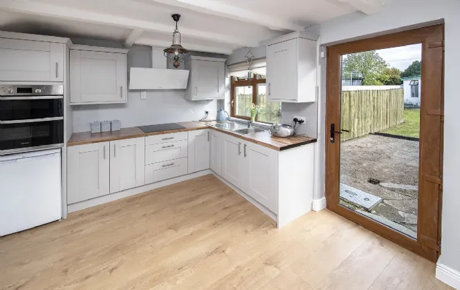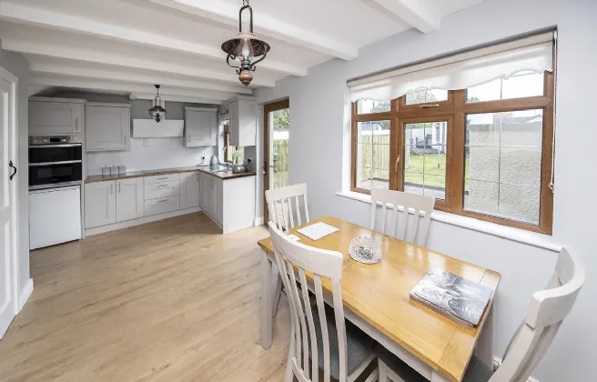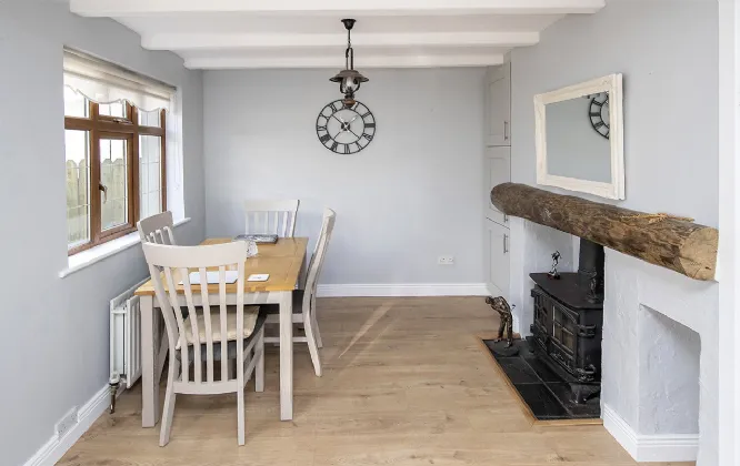 Kitchen/Dining 2.64m x 2.67m Timber floor, painted walls, two windows to the rear with curtains, PVC door with glass panel to the rear garden, two centre lights, fitted kitchen, Belfast sink, airing cupboard, fitted stove in a traditional fireplace, aesthetic loft style beams in the ceiling.