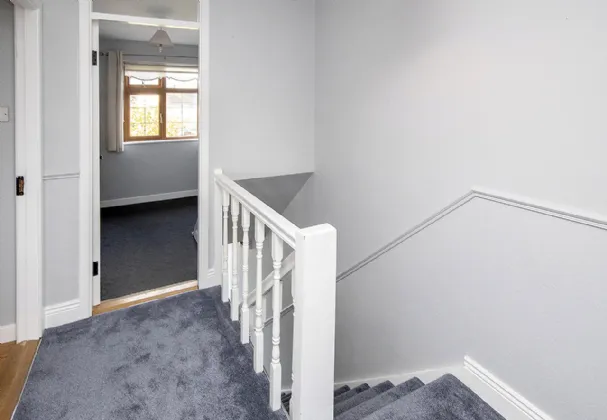Landing 2.51m x 2.08m Carpet floor, wall paper to dado level, painted walls, centre light, smoke alarm, attic access.