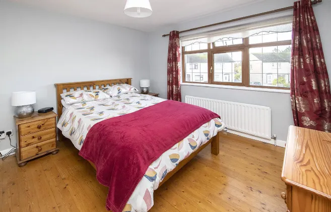 Master Bedroom 3.94m x 3.2m Timber floor, painted walls, window to the front with curtains, centre light, t.v. point, fitted wardrobe.