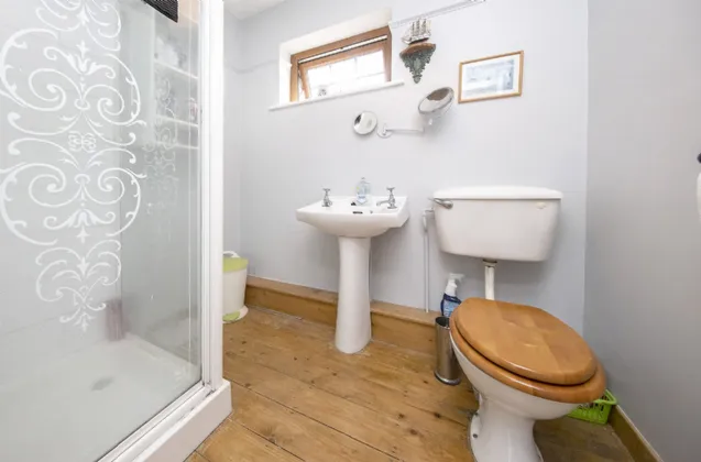 The lounge is located to the front of the house and is a cosy room with its open fireplace. The kitchen/dining room is a charming room with its fitted stove in a traditional fireplace, loft style ceiling beams and half timber door leading to the rear garden. Upstairs, the master, second and third bedrooms are of generous size. There is also a spacious shower room to the rear.