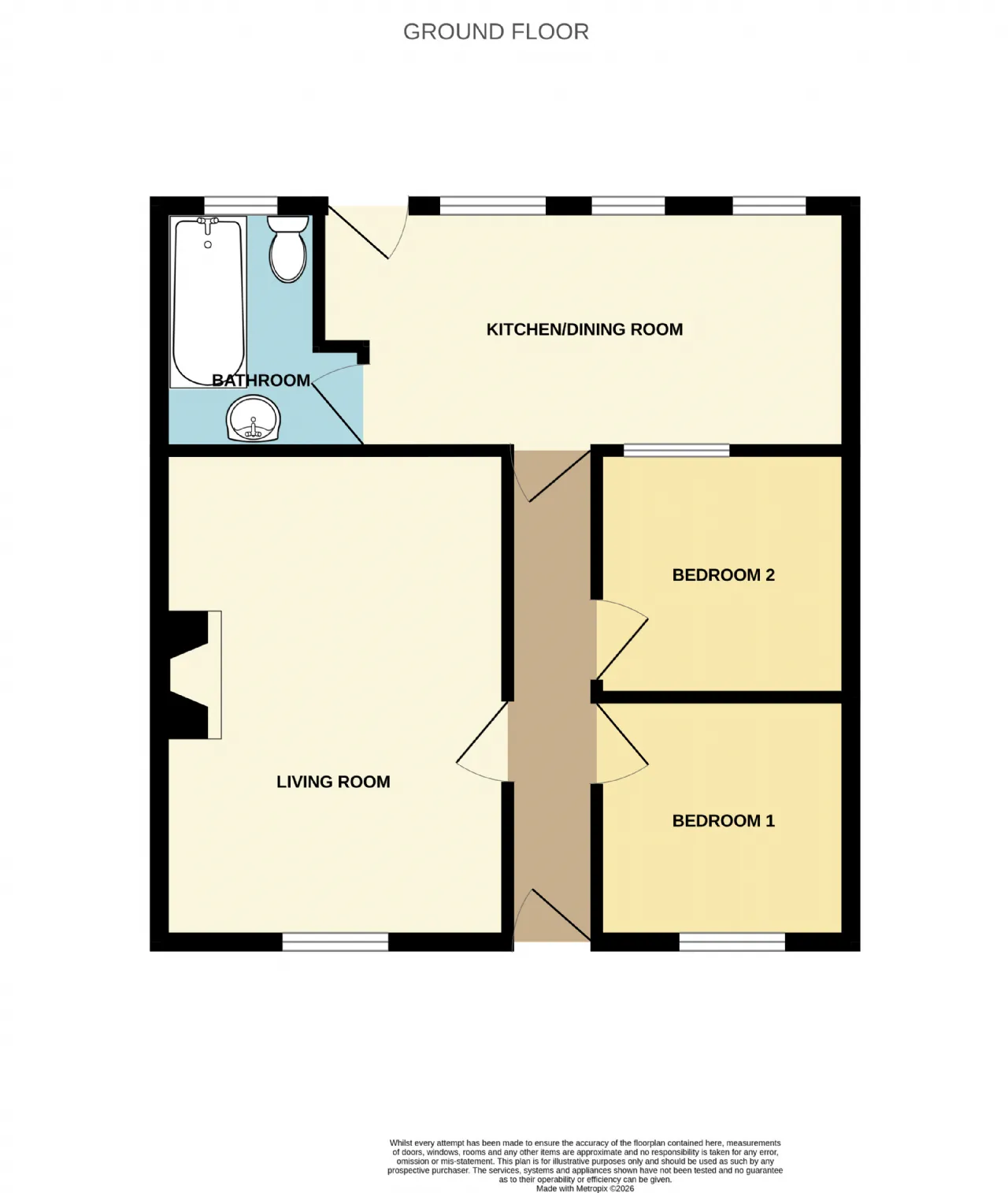 The living room is located to the front of the house and is a good size with an open fireplace. There is one bedroom to the street front and one to the rear. The kitchen/dining is located to the rear and is the full width of the house with an adjoining bathroom.