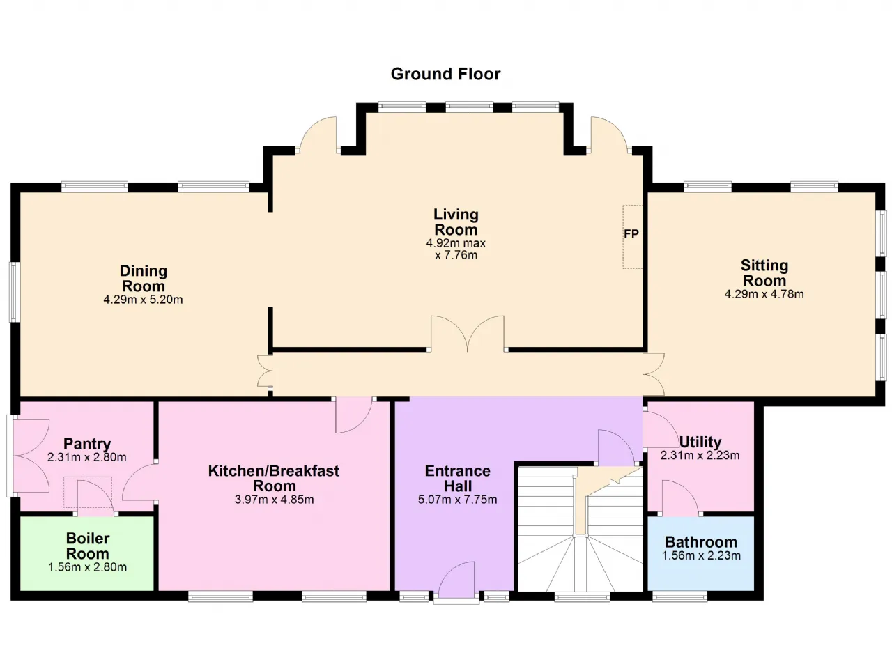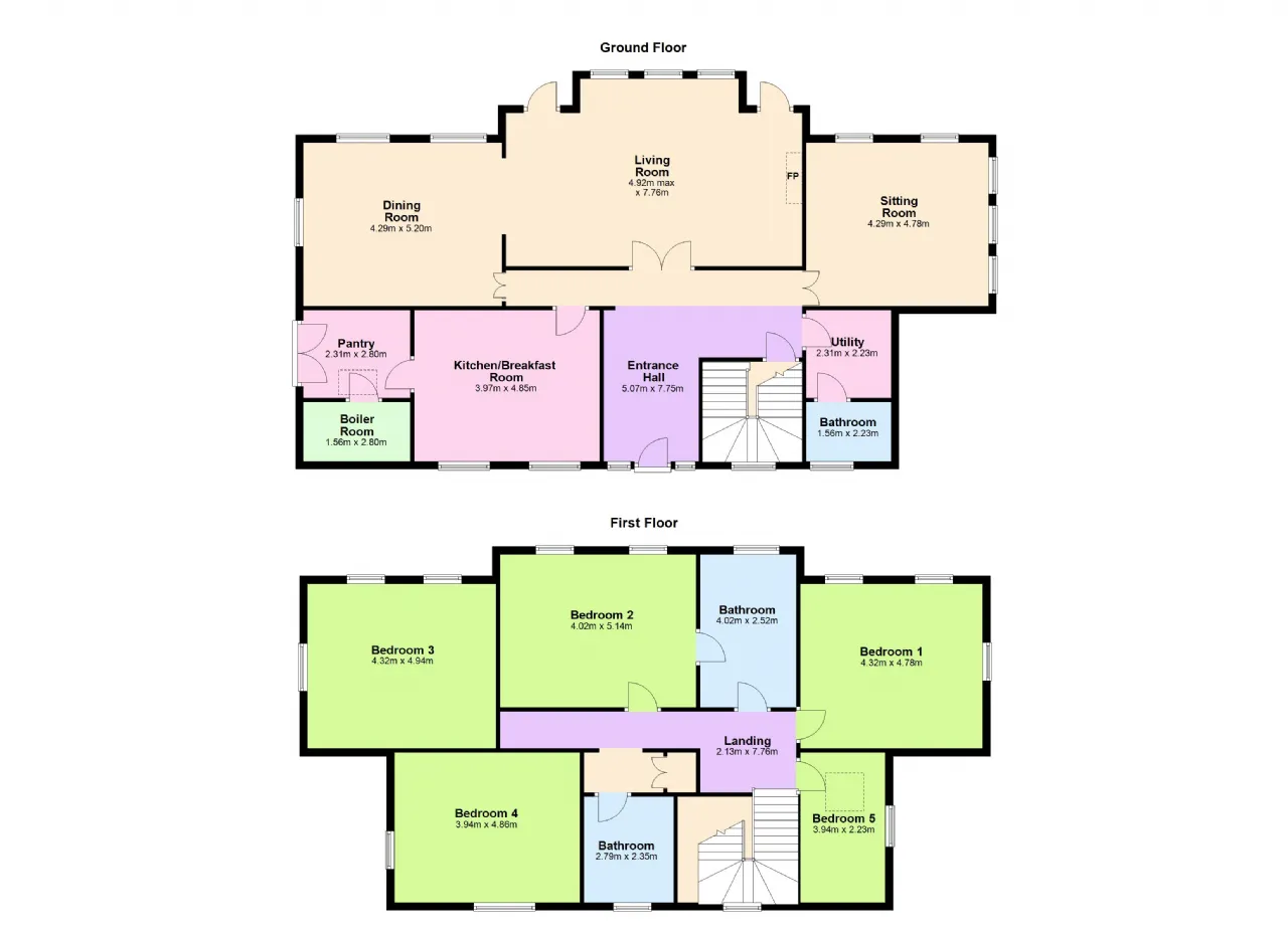 Inside, there are five generously sized bedrooms and three well-appointed bathrooms, while the ground floor is centered around a spacious open plan living and dining room. This space features a wood-burning stove and timber sash windows framing views of the garden, the heart of the home. There is also a large study perfect for relaxing or entertaining. Throughout the lower floor, hardwood flooring enhances the home’s warmth and character.