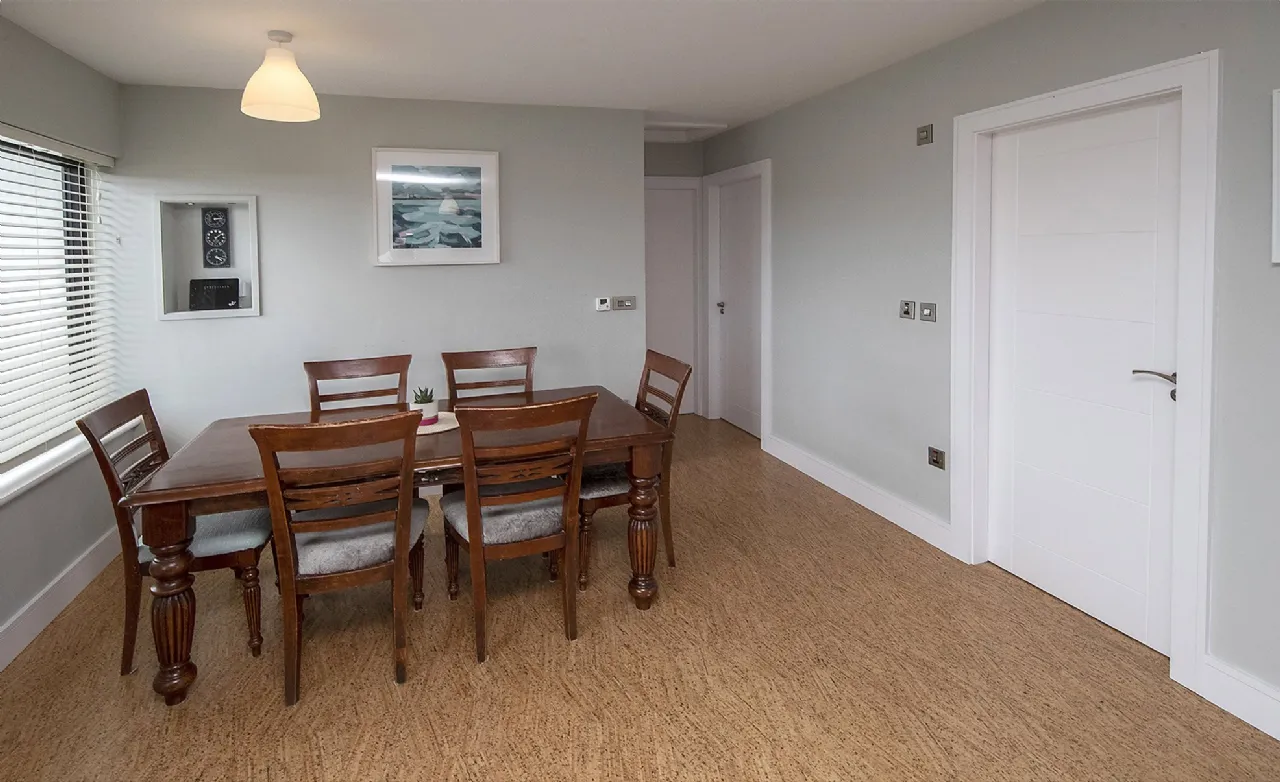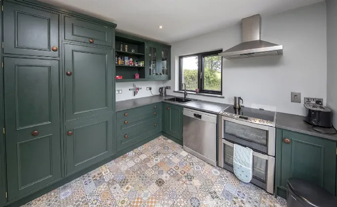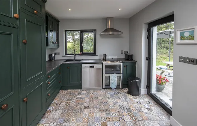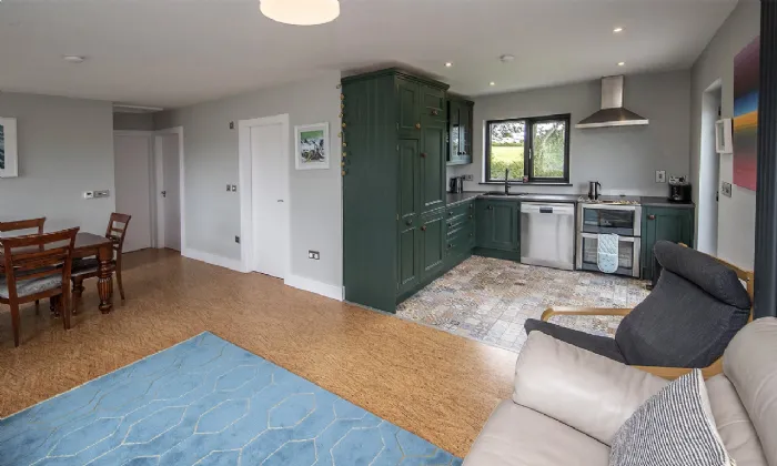 Kitchen Area 2.72m x 2.9m Modern fitted kitchen, HQ cork floor, painted walls, window to the rear with blinds, spot lights, glass door to rear garden.