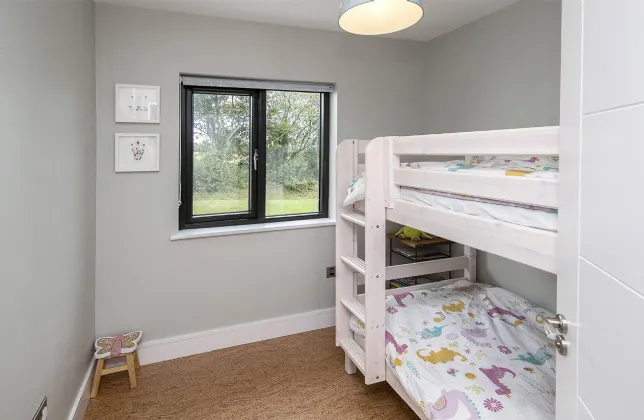 Bedroom Three 2.6m x 2.5m HQ cork floor, painted walls, window to the rear, centre light.
