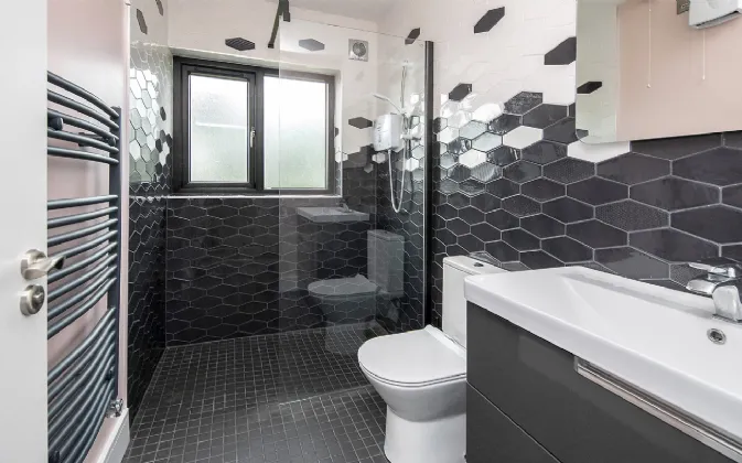 Shower Room 2.6m x 1.52m Tiled floor, tiled walls, opaque window, fitted vanity unit, wc, walk-in shower, heated towel rail.