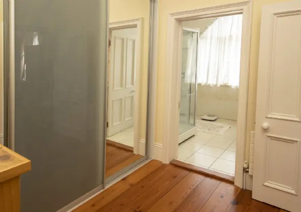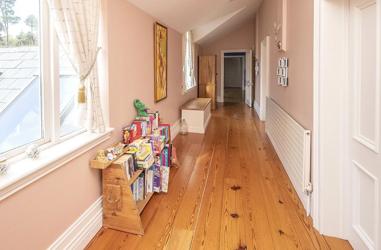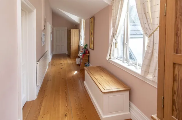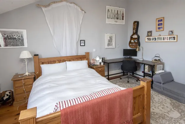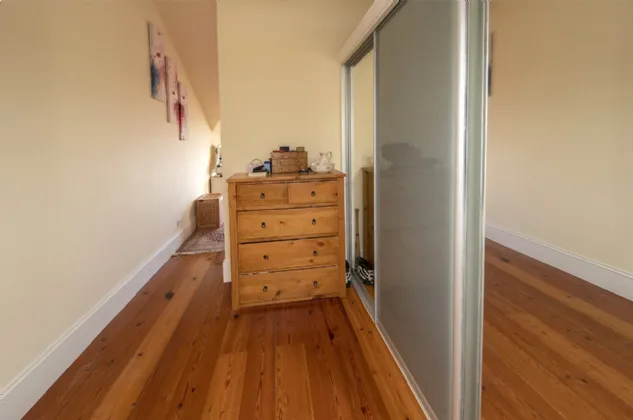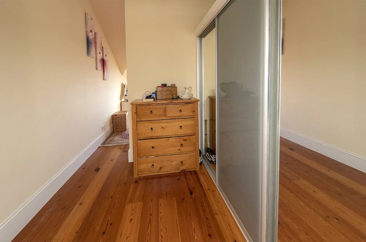 Bedroom Five 7.52m x 3.76m Solid timber floor, painted walls, window to the side and to the front, curtains, centre light, T.V point.