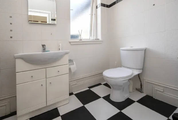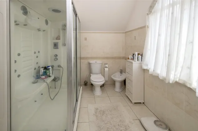 Bathroom/Shower Room 1.83m x 3.63m Tiled floor, tiled walls, Velux window, whb, WC, bath, overhead shower, centre light.