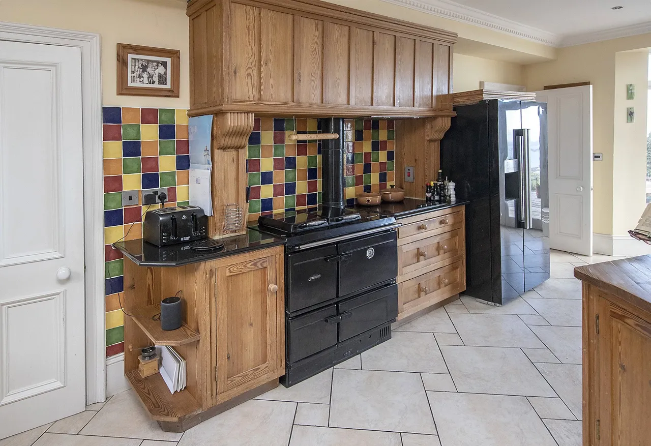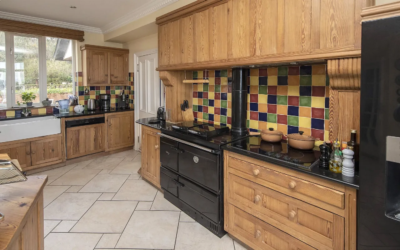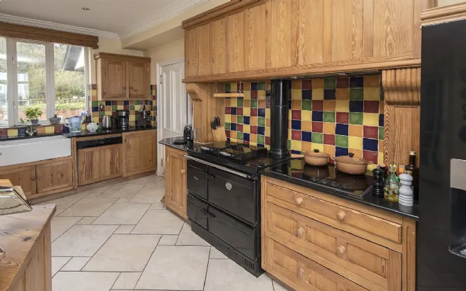 Kitchen/Dining 6.58m x 5.66m Tiled floor, painted walls, French doors to decking, door to the enrance hall and the lounge, spot lights, country style fitted kitchen with feature Stanley Range, dishwasher.