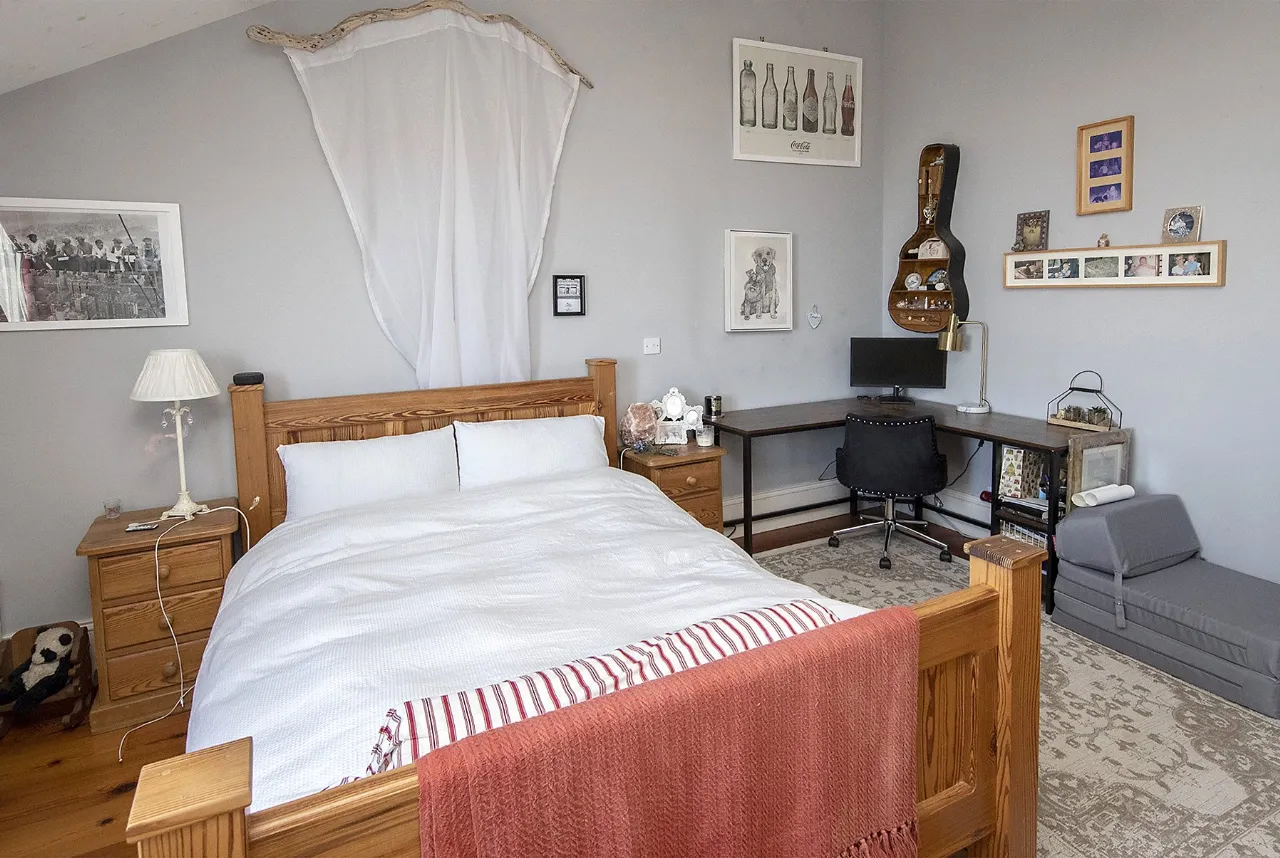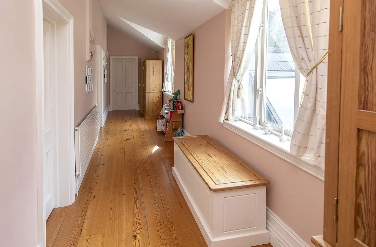 Bedroom Four 4.14m x 4.9m Solid oak floor, painted walls, window to the front, curtains, centre light.