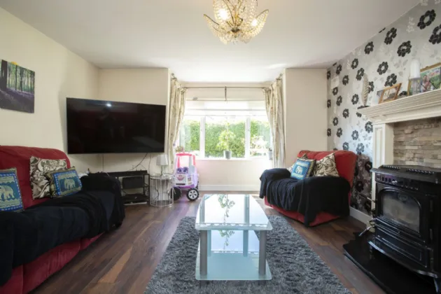 Living Room 4.52m x 5.35m Laminate floor, feature lighting, TV point, Solid fuel stove with back boiler & feature stone and timber surround.