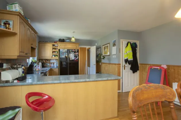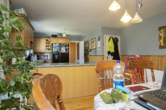 The accommodation consists of an entrance hall with laminate floor leading to the living room with laminate floor and solid fuel stove with back boiler and feature stone and timber surround. The kitchen is impressively fitted with ample storage, breakfast bar and is open plan with the dining area. Sliding doors from the dining area bring you to the conservatory. Off the kitchen is a utility room with extra storage. A ground floor bedroom with laminate flooring and a guest WC completes the ground floor.