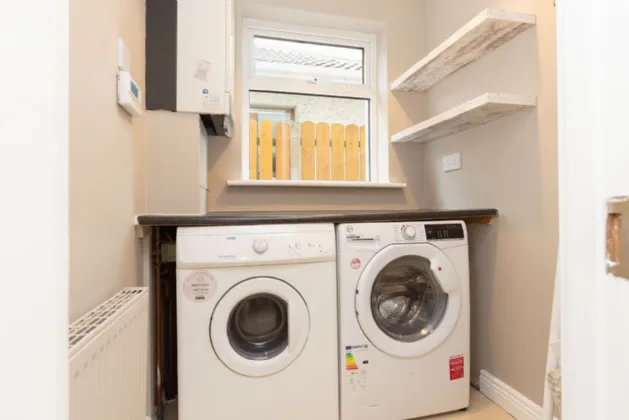 The kitchen is bright and well-equipped, fitted with ample storage. Adjoining the kitchen, a utility room, plumbed for a washer and dryer. A