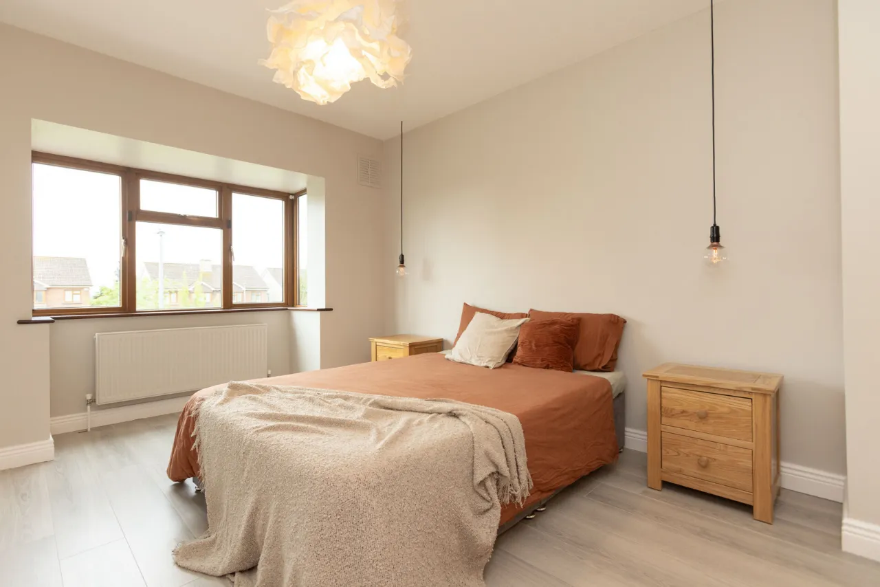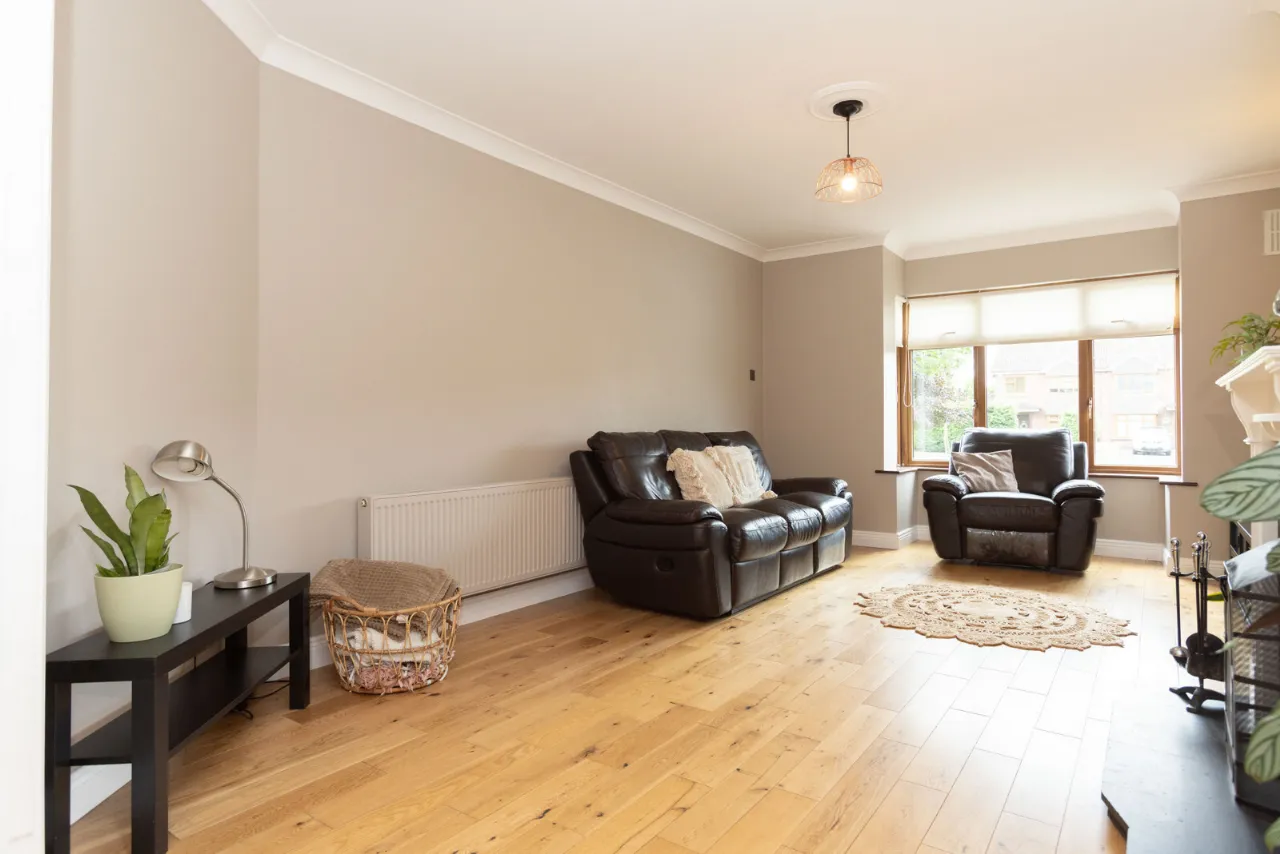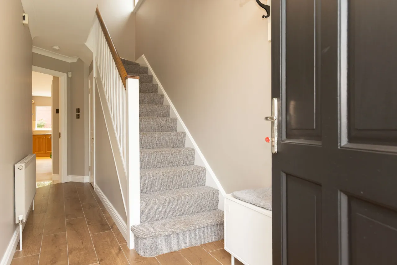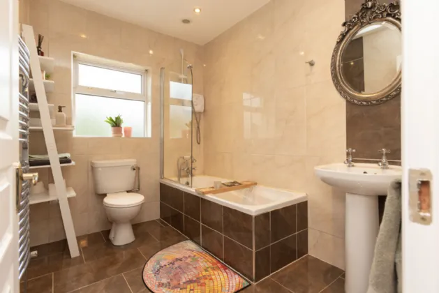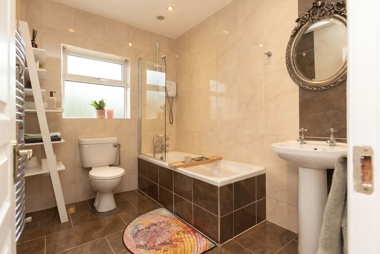 Upstairs, the landing leads to three well-proportioned bedrooms, each with built-in wardrobes. The primary bedroom is finished with laminate flooring and includes an en-suite, while the second bedroom comes with carpet. The main family bathroom is a fully tiled three-piece suite.