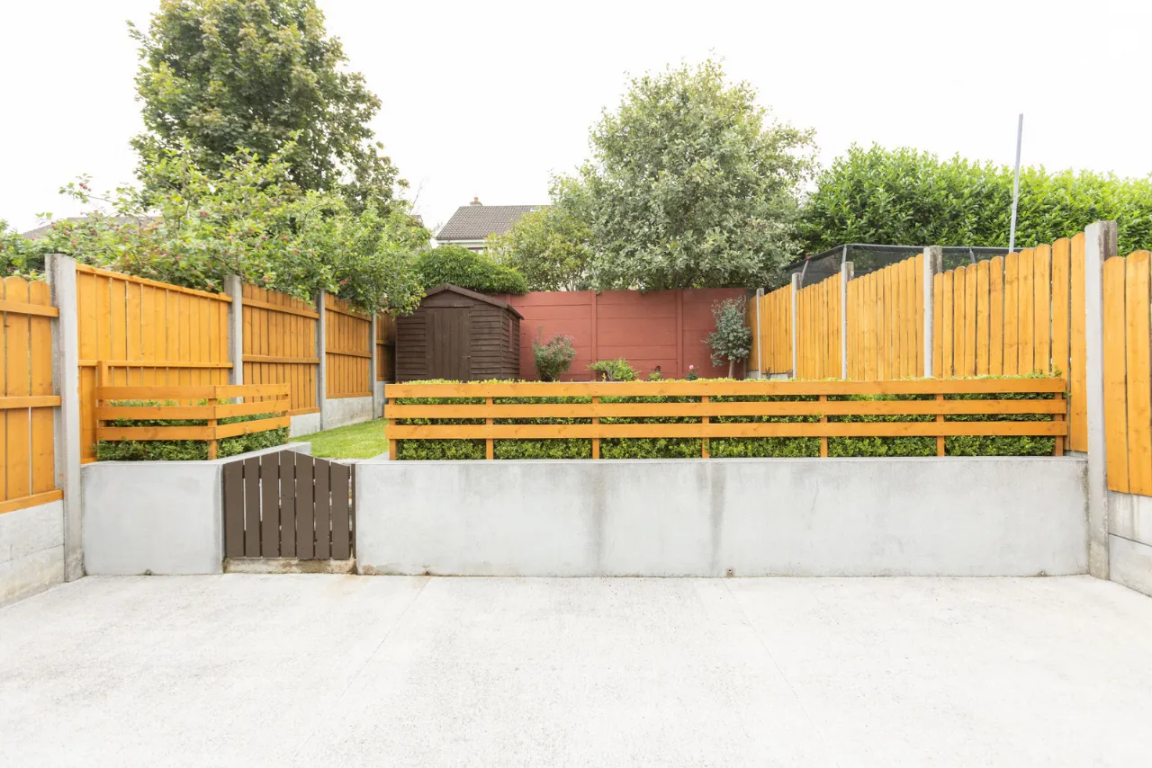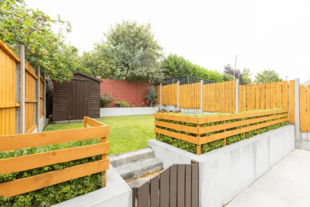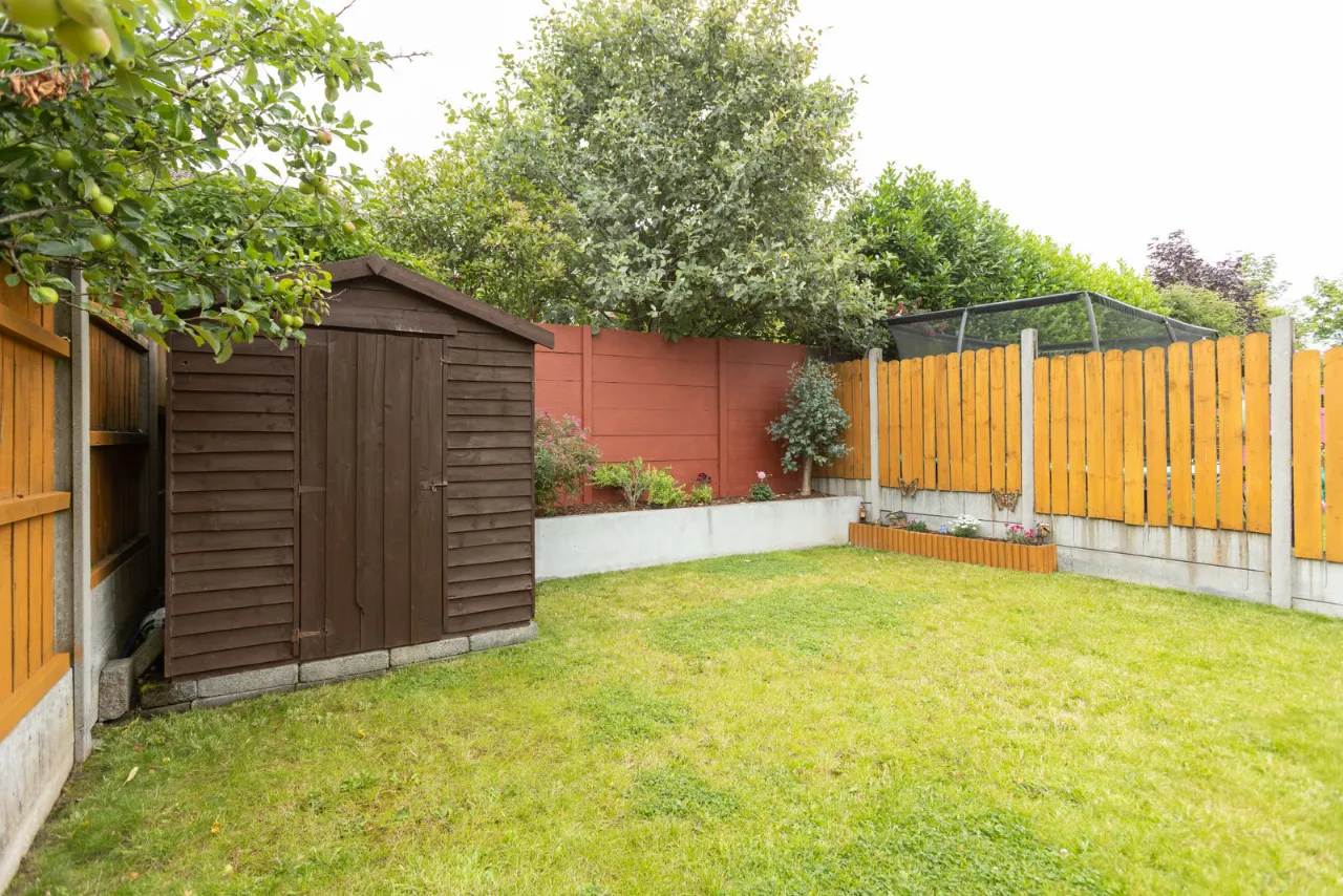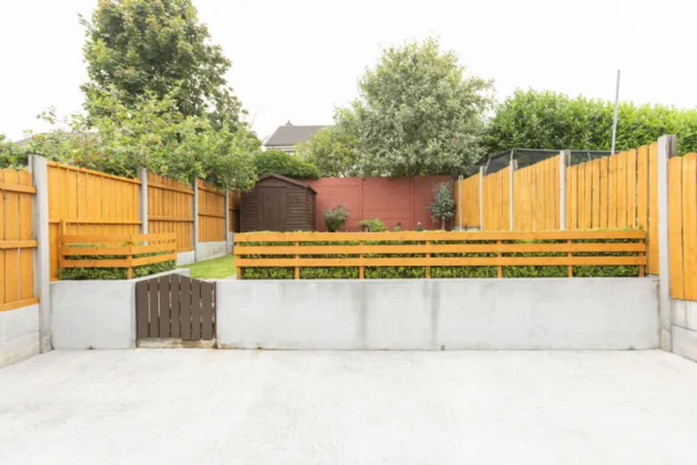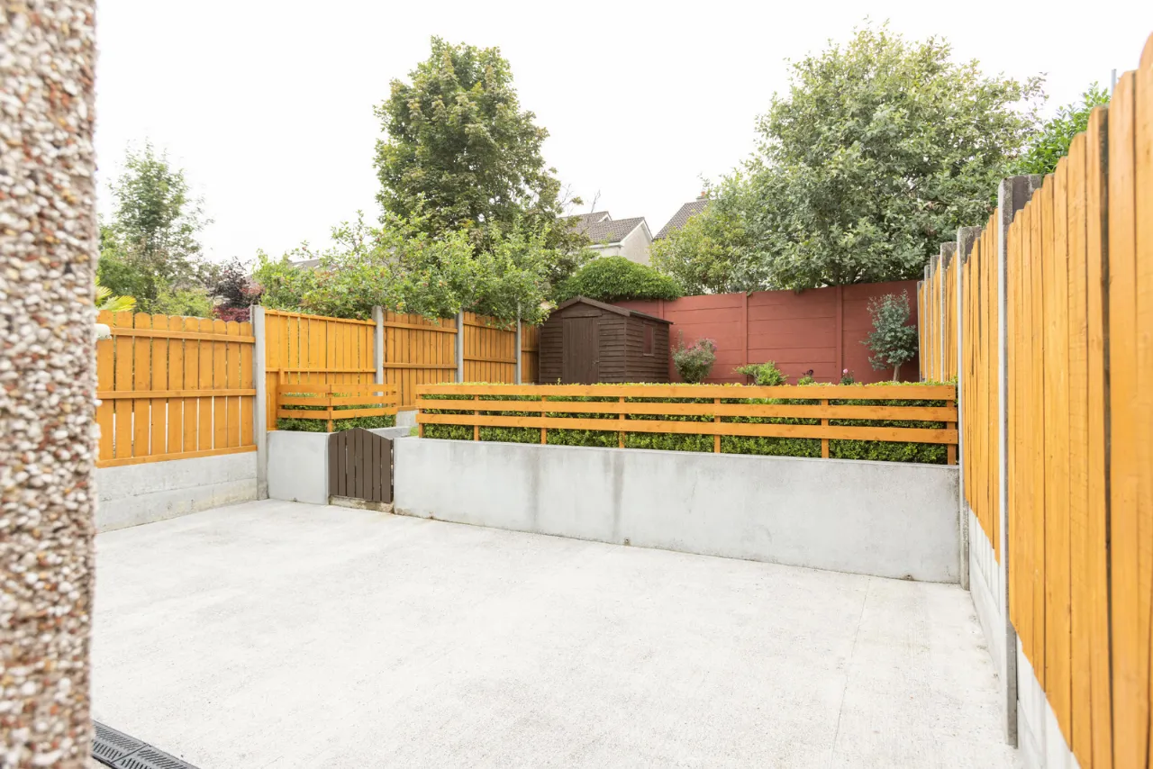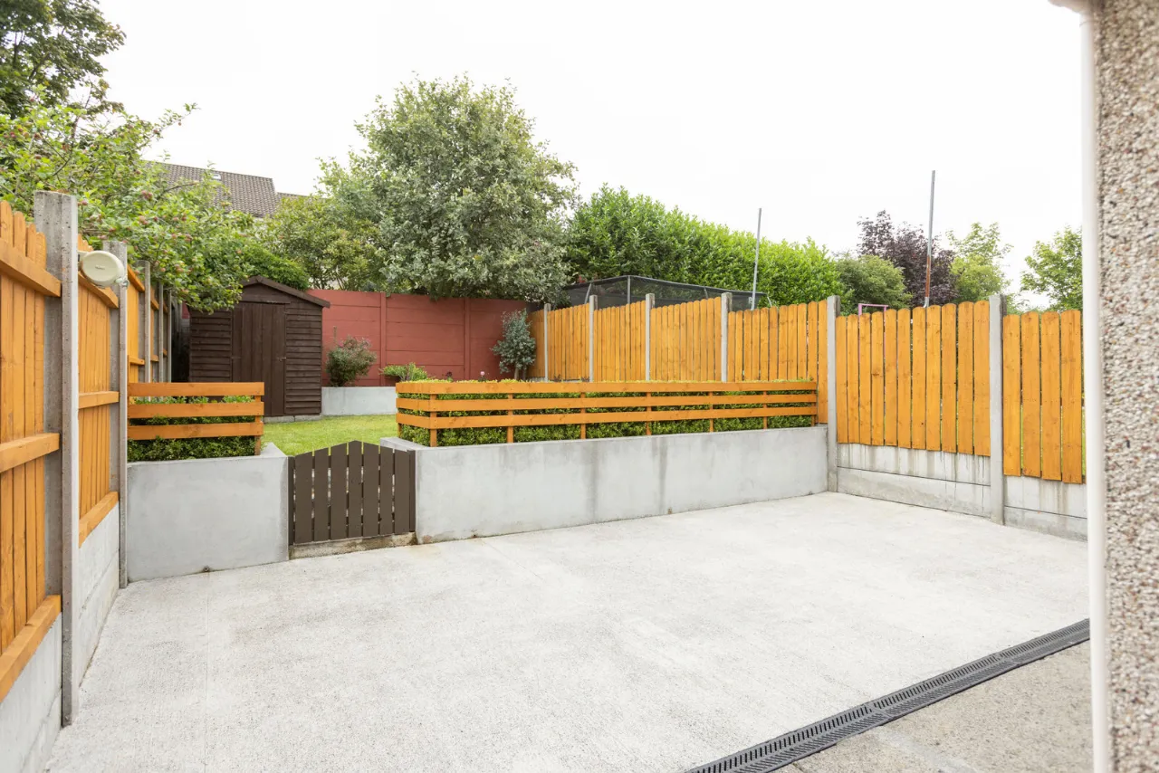 landscaped, featuring a raised lawn bordered with neat shrubbery and accessed by steps, a patio area and a garden shed. Its location is ideal—just off the main road between Mullingar town