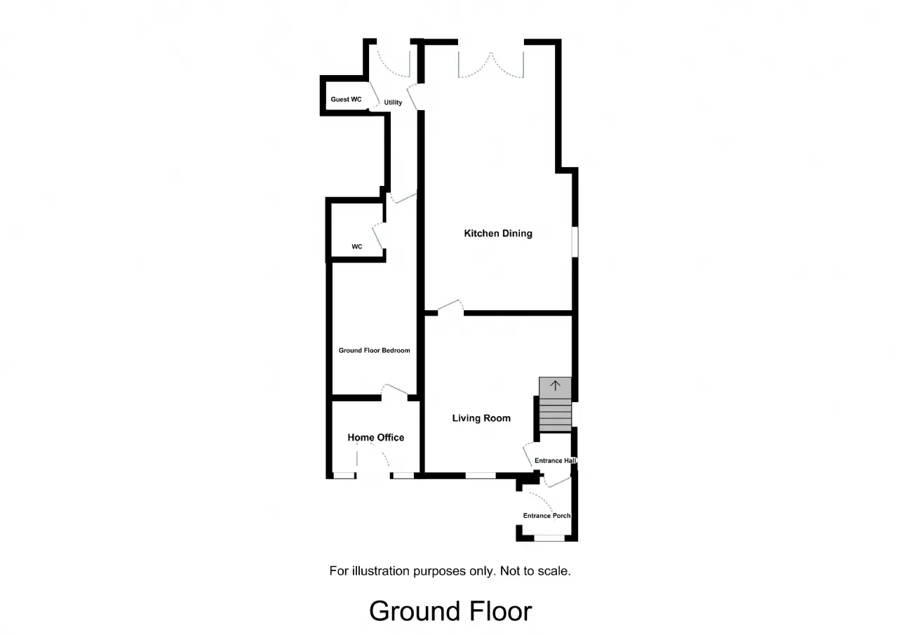 The welcoming entrance hall leads to a sitting room featuring laminate timber flooring, fitted shelving, and a solid fuel stove. To the rear, the spacious kitchen and dining area with fitted units, timber worktops and tiled splashbacks. This room opens into a utility area with fitted storage and rear access, along with a guest WC. A ground floor bedroom with en-suite shower room. A separate home office or study completes the ground floor.