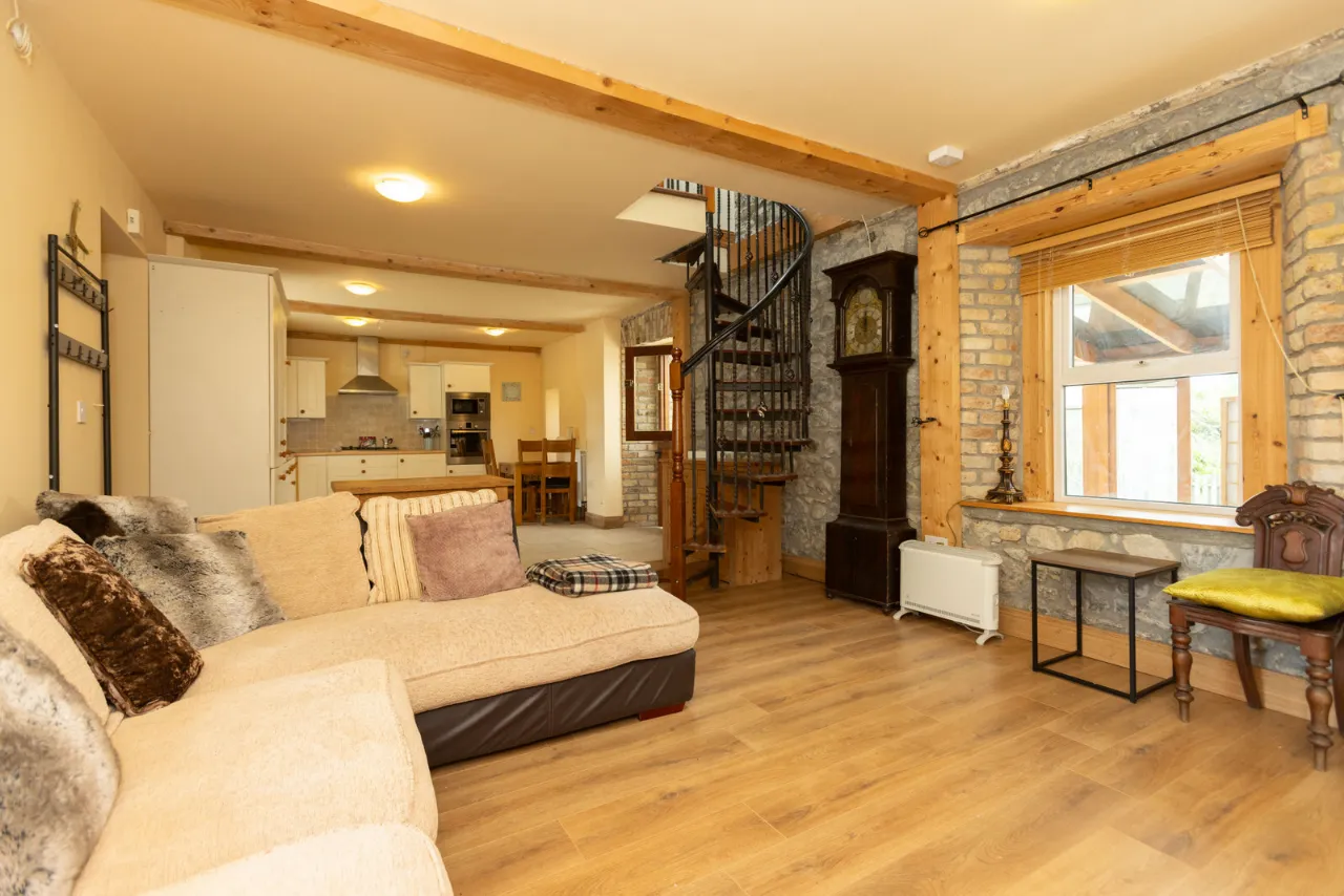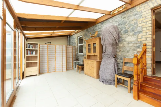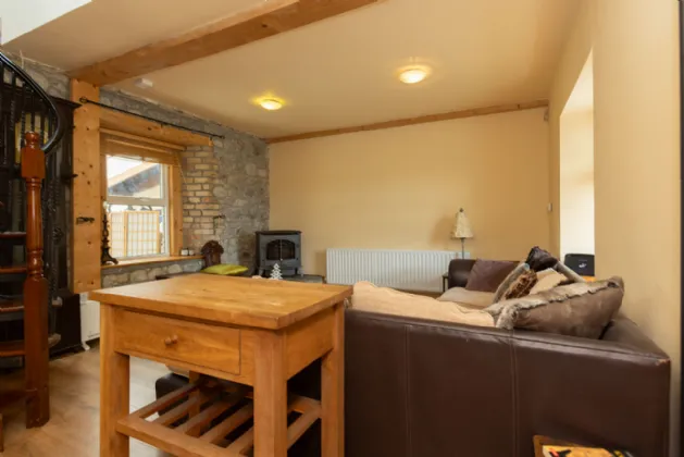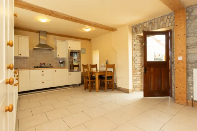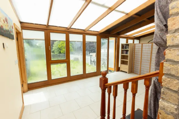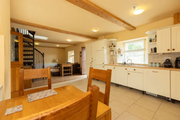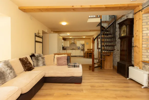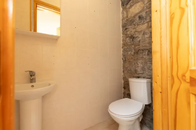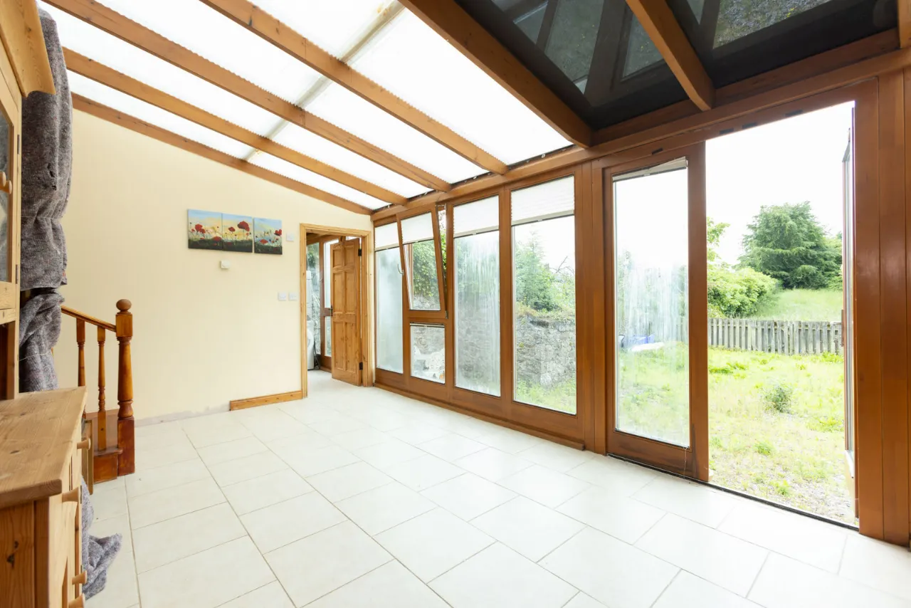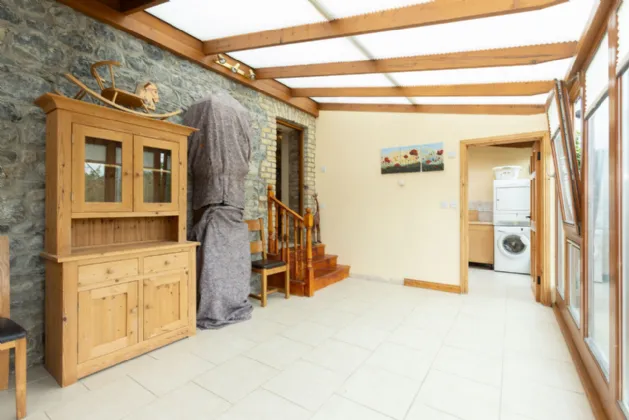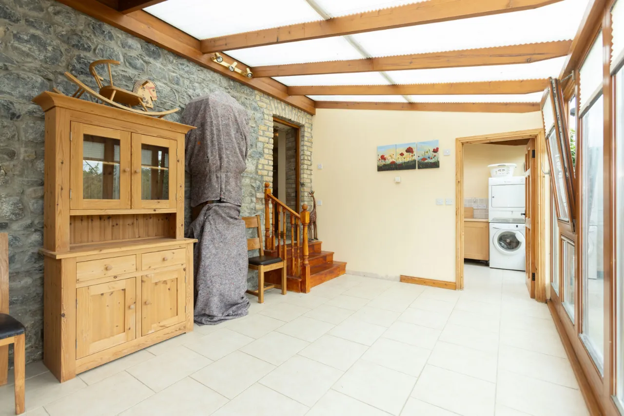 Inside, the home is bright and welcoming with stylish finishes. The spacious open-plan kitchen, dining, and living area features a fully fitted kitchen with tiled flooring, original exposed stone detailing, and a warm living space anchored by an oil-fired stove. A sun-drenched sunroom — complete with skylights and double patio doors — providing access to a large private garden. A separate utility room, complete with Belfast sink and ample space for laundry appliances, while a guest WC rounds out the ground floor.