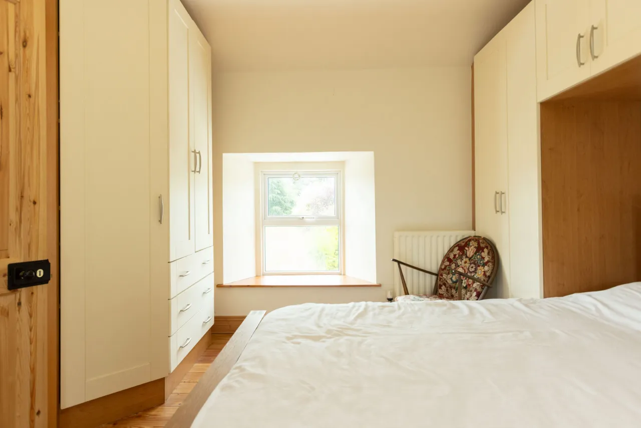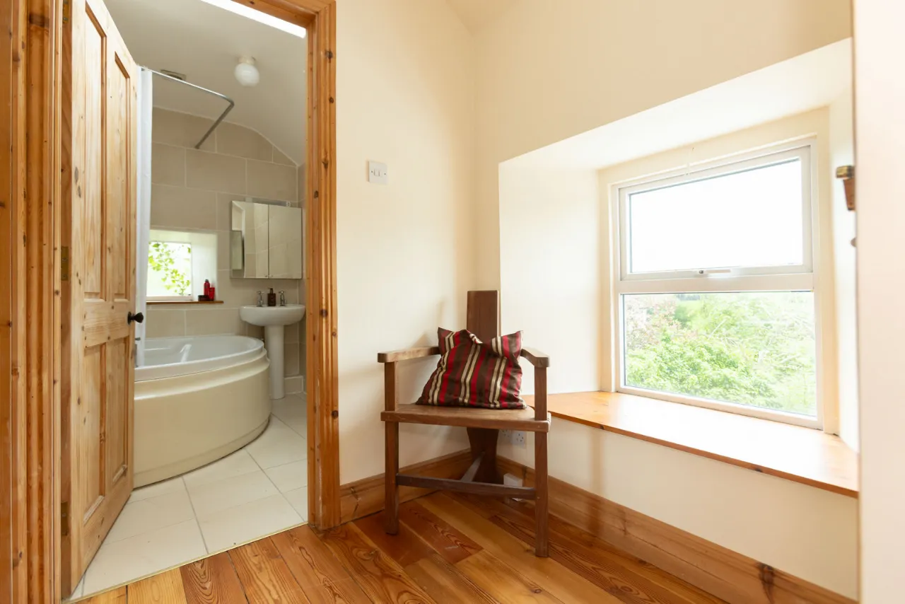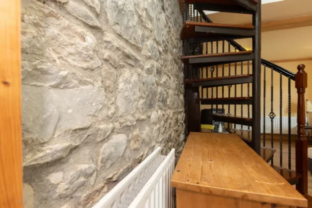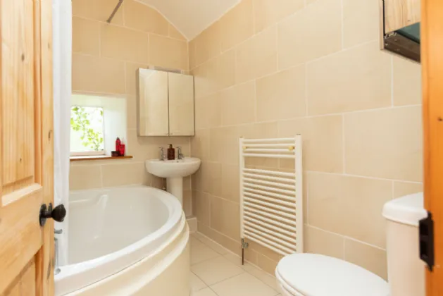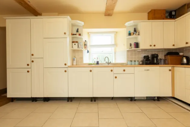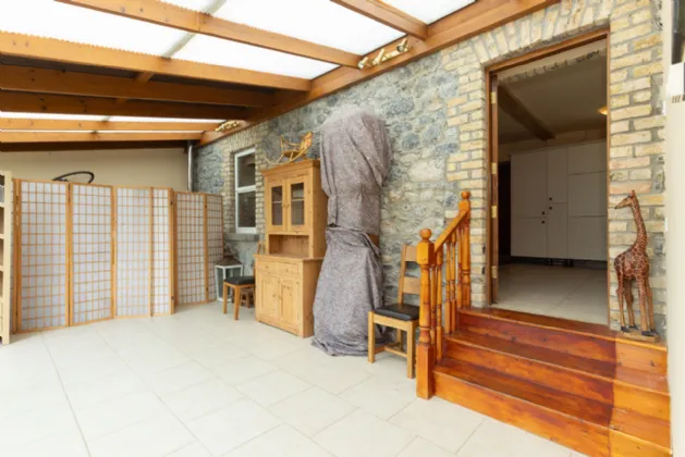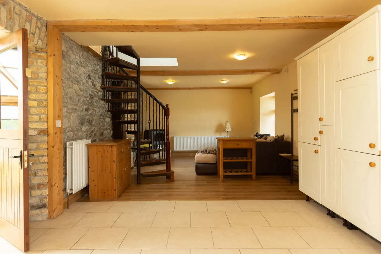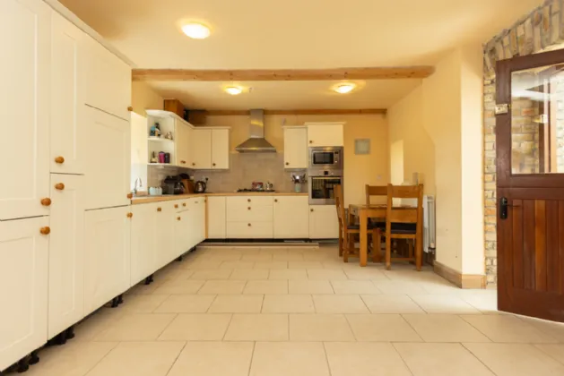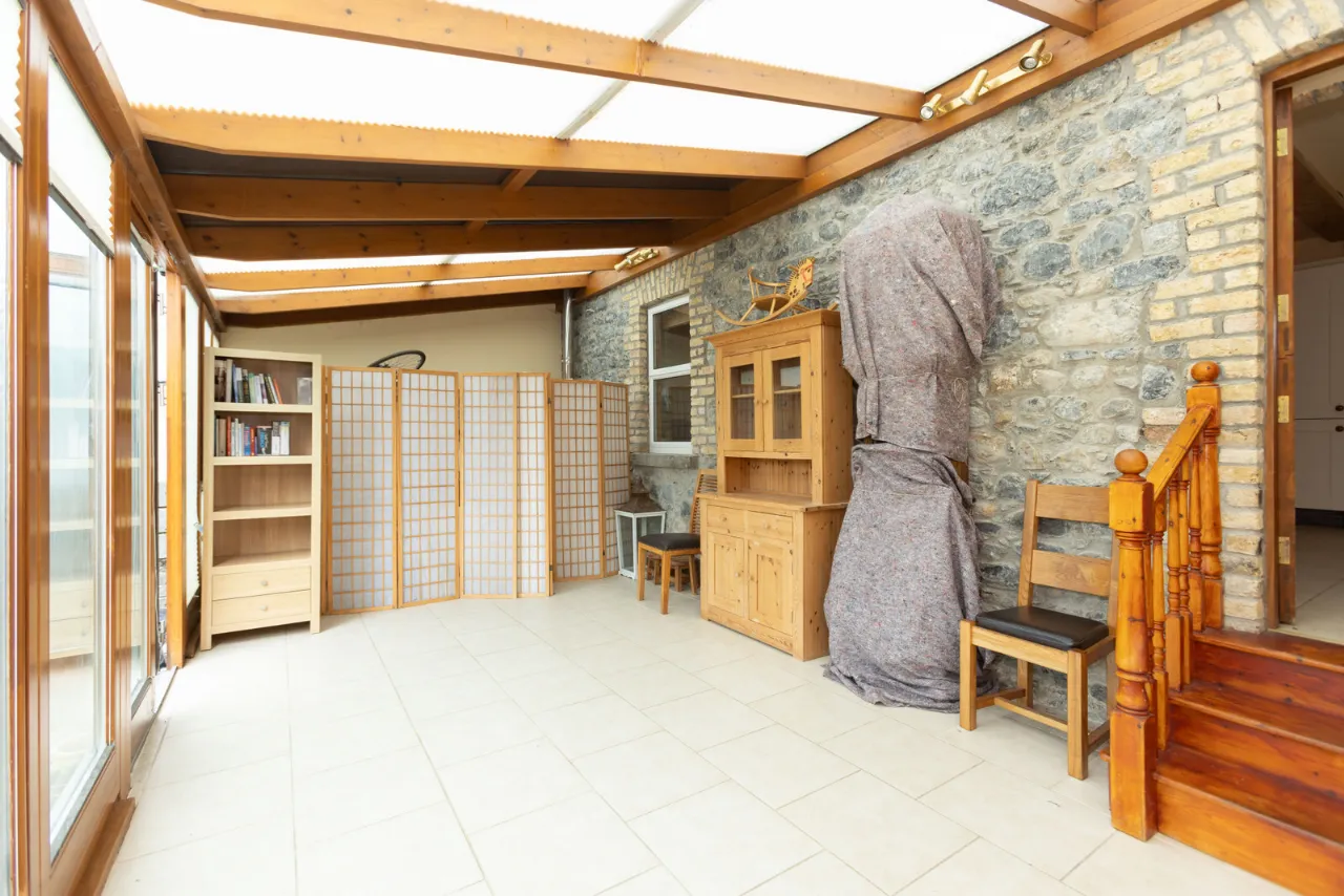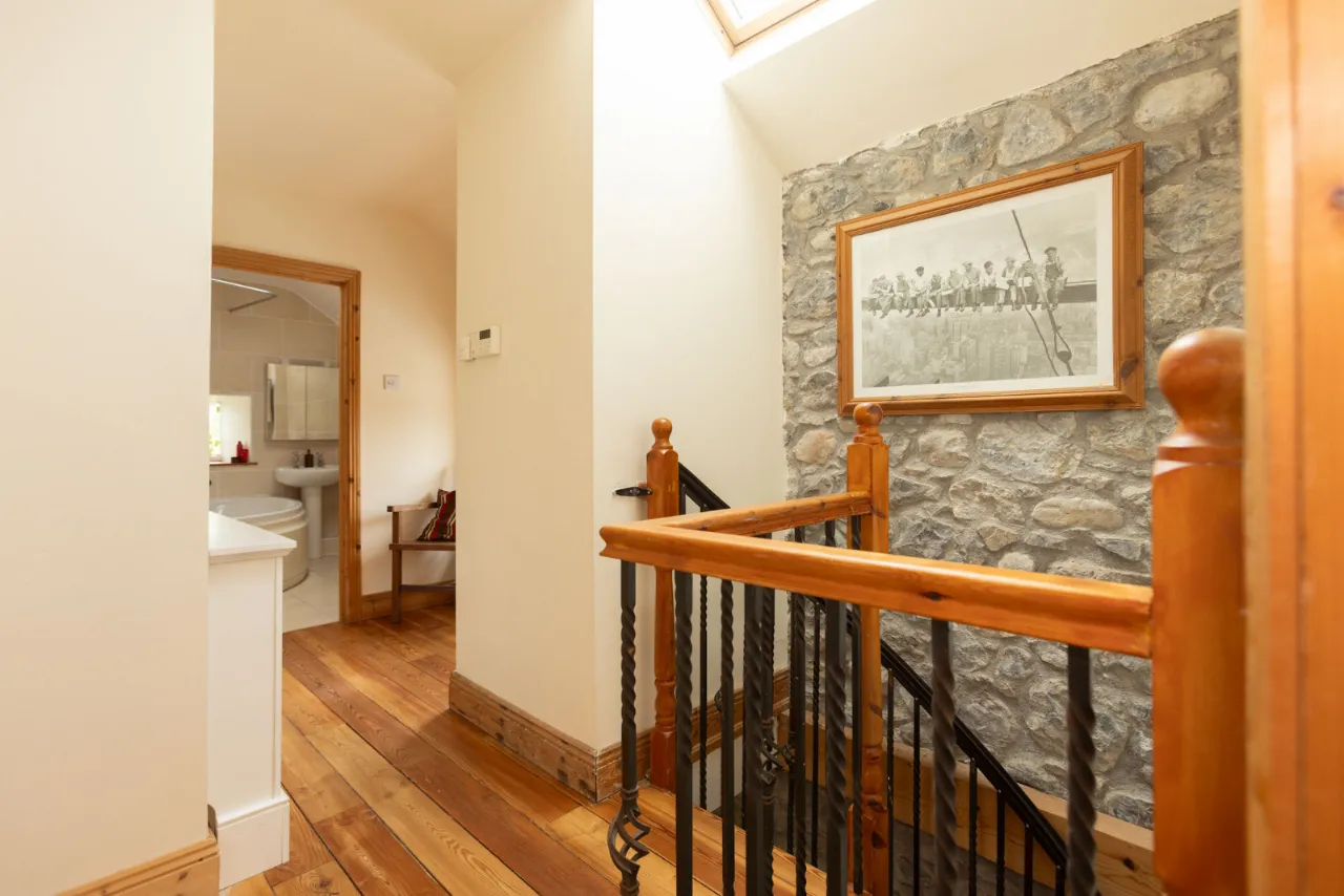 Inside, the home is bright and welcoming with stylish finishes. The spacious open-plan kitchen, dining, and living area features a fully fitted kitchen with tiled flooring, original exposed stone detailing, and a warm living space anchored by an oil-fired stove. A sun-drenched sunroom — complete with skylights and double patio doors — providing access to a large private garden. A separate utility room, complete with Belfast sink and ample space for laundry appliances, while a guest WC rounds out the ground floor.