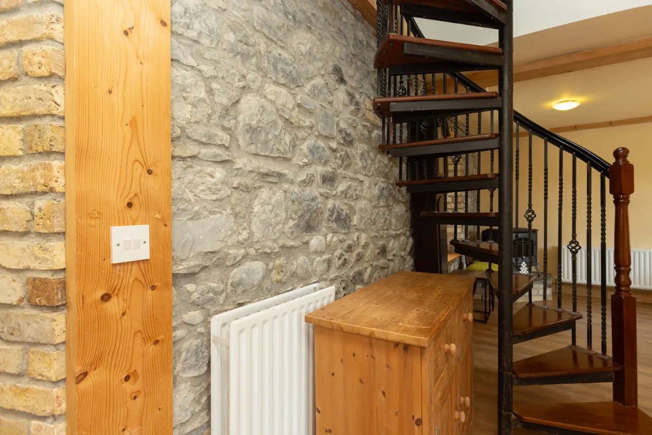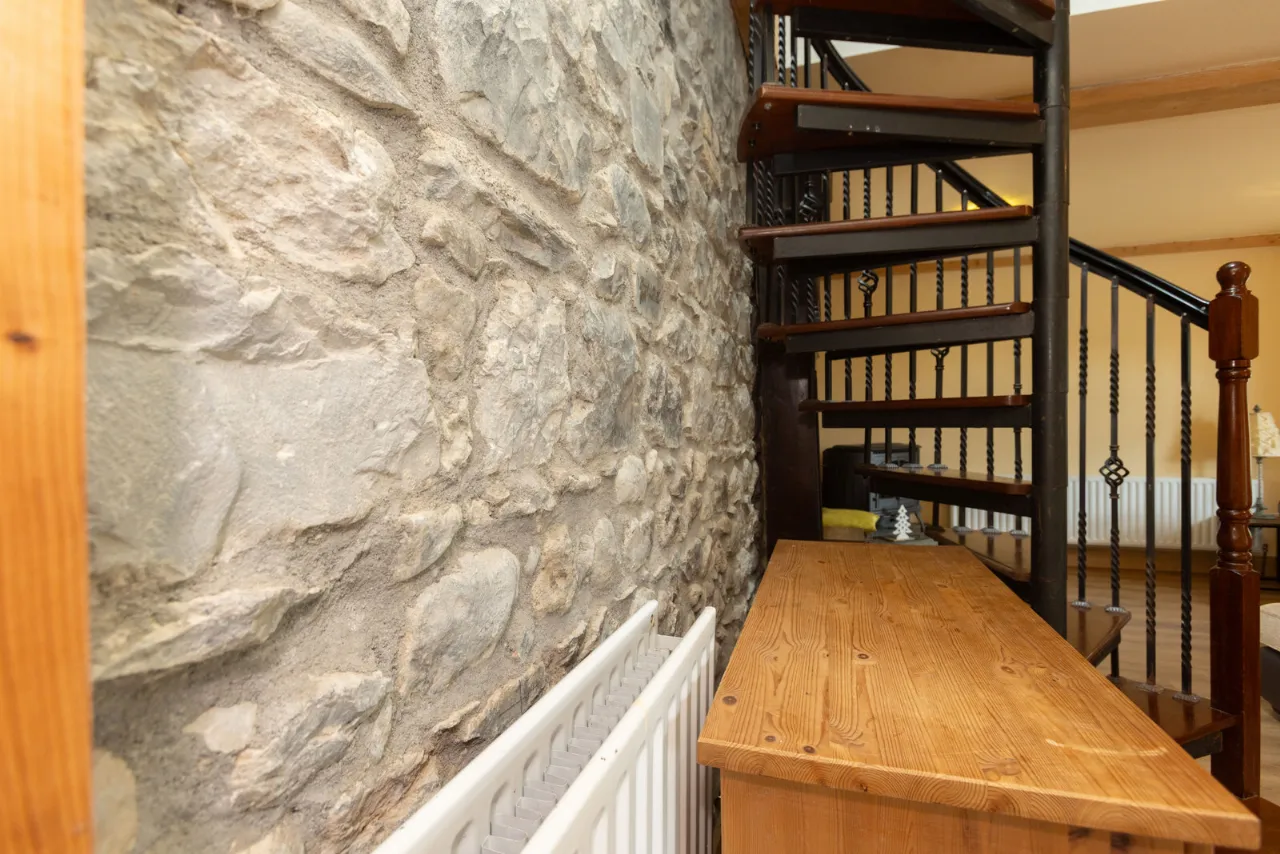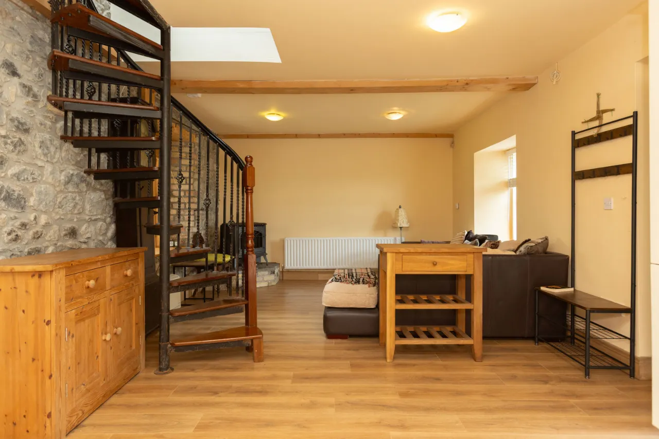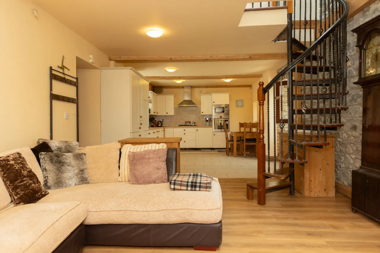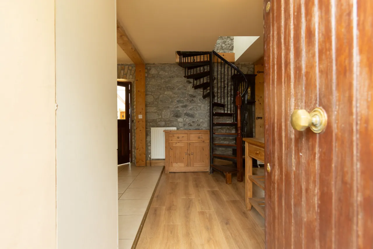 Inside, the home is bright and welcoming with stylish finishes. The spacious open-plan kitchen, dining, and living area features a fully fitted kitchen with tiled flooring, original exposed stone detailing, and a warm living space anchored by an oil-fired stove. A sun-drenched sunroom — complete with skylights and double patio doors — providing access to a large private garden. A separate utility room, complete with Belfast sink and ample space for laundry appliances, while a guest WC rounds out the ground floor.