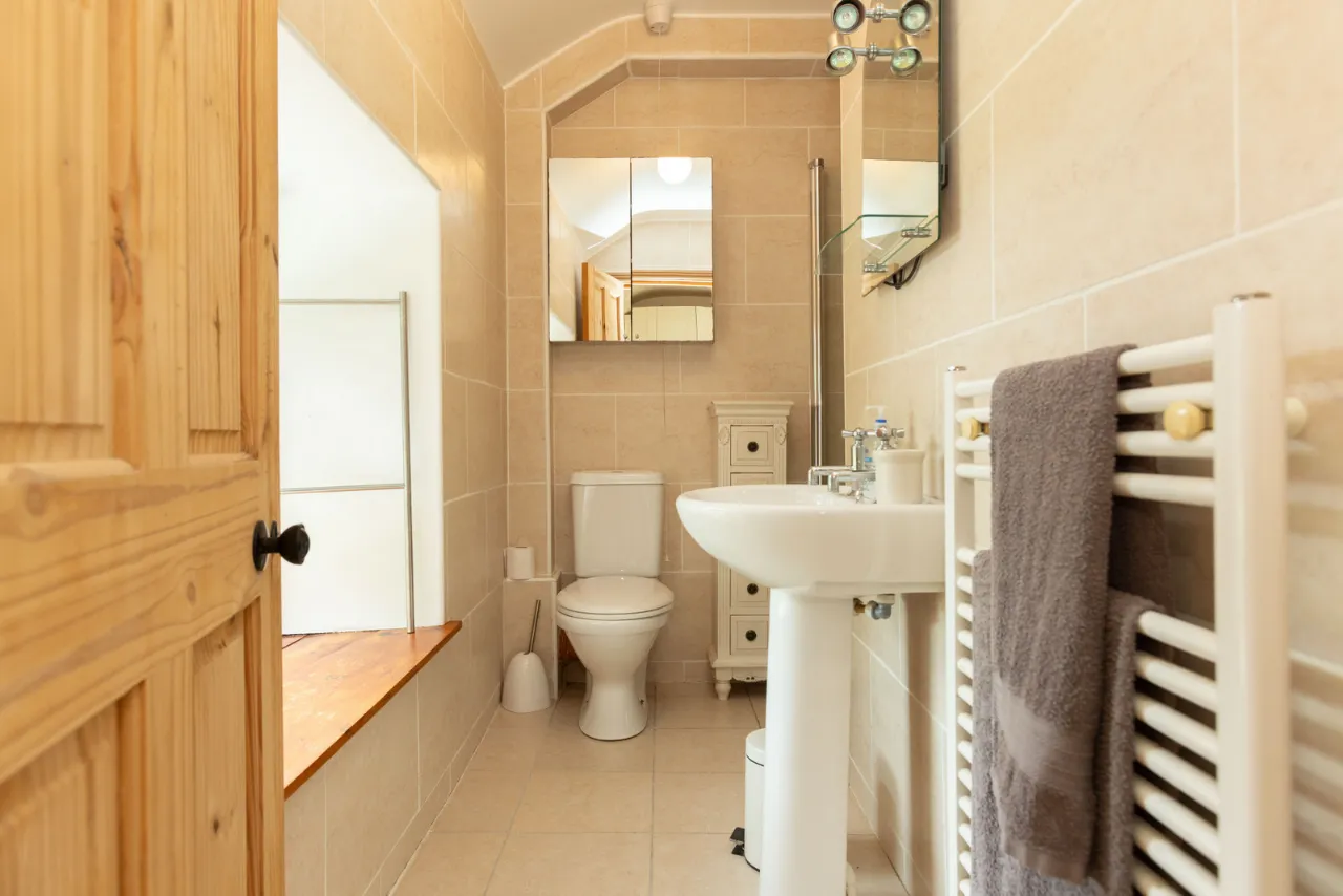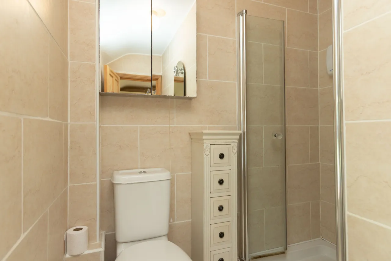 En-Suite 2.92m x 1.04m Tiled floor, wall tiling, WC, wash hand basin, tiled electric shower cubicle.