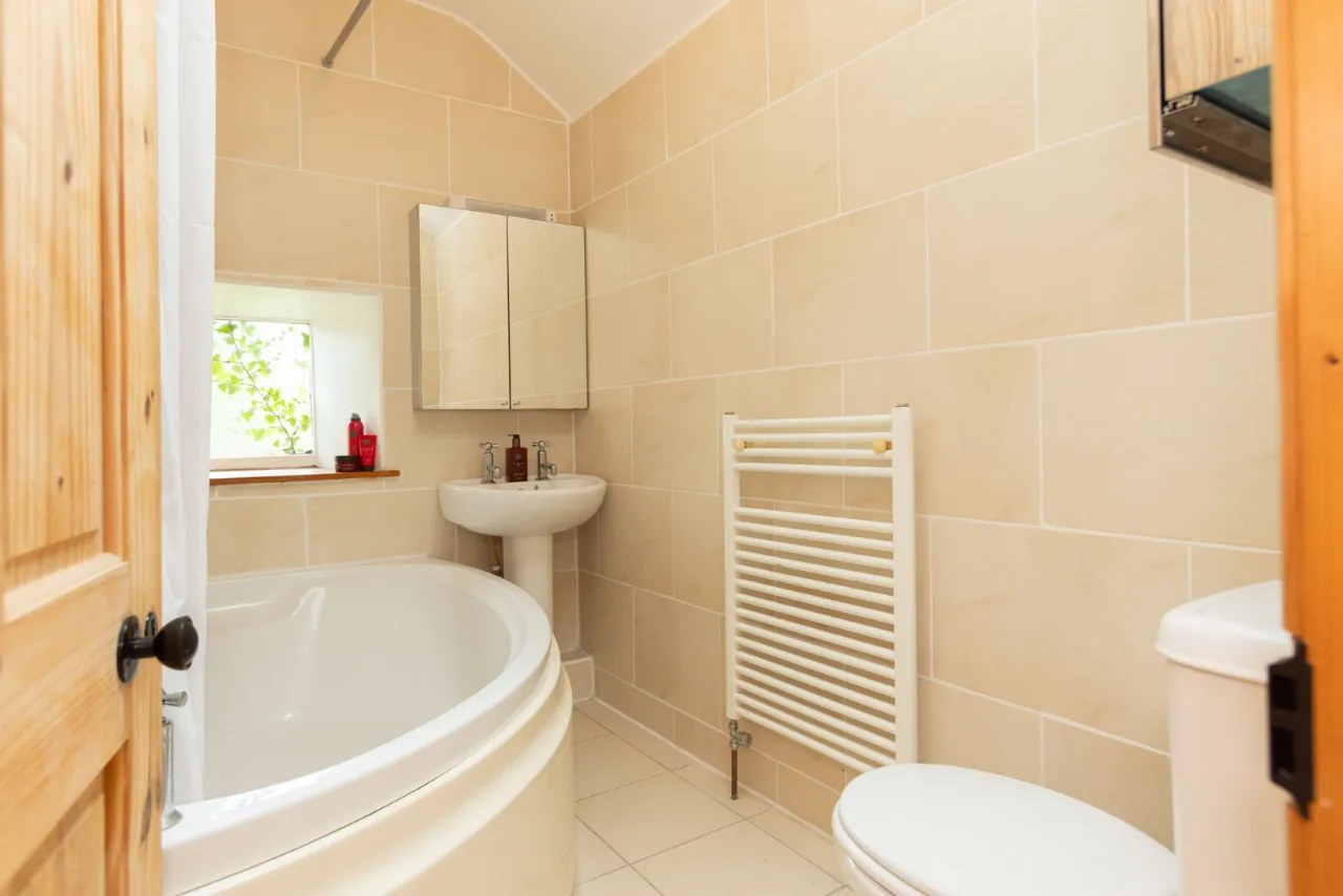 Bathroom 2.63m x 1.57m Tiled floor, wall tiling, WC, corner bath with pump shower.