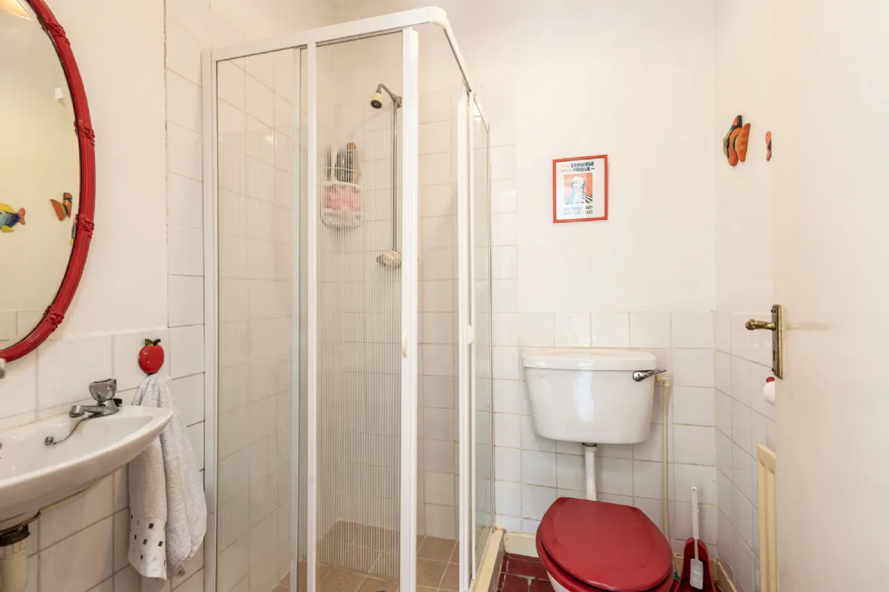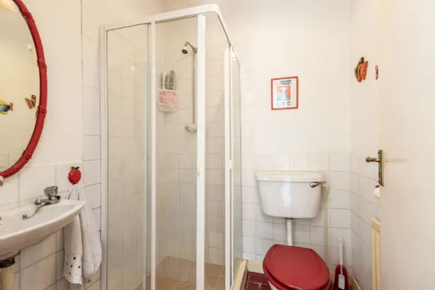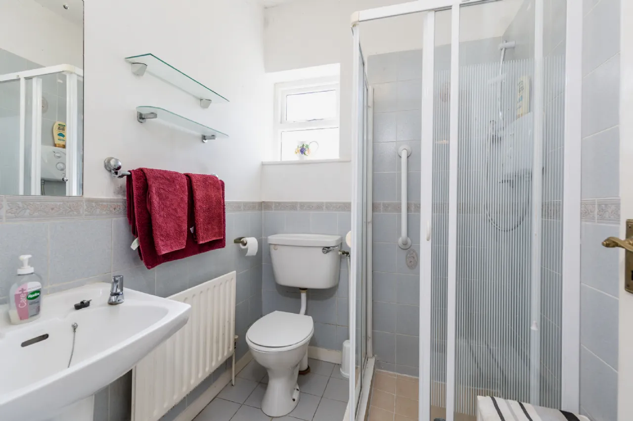 Shower Room 1.7m x 1.6m with tiled floor and part tiled walls, WC, WHB, mains shower