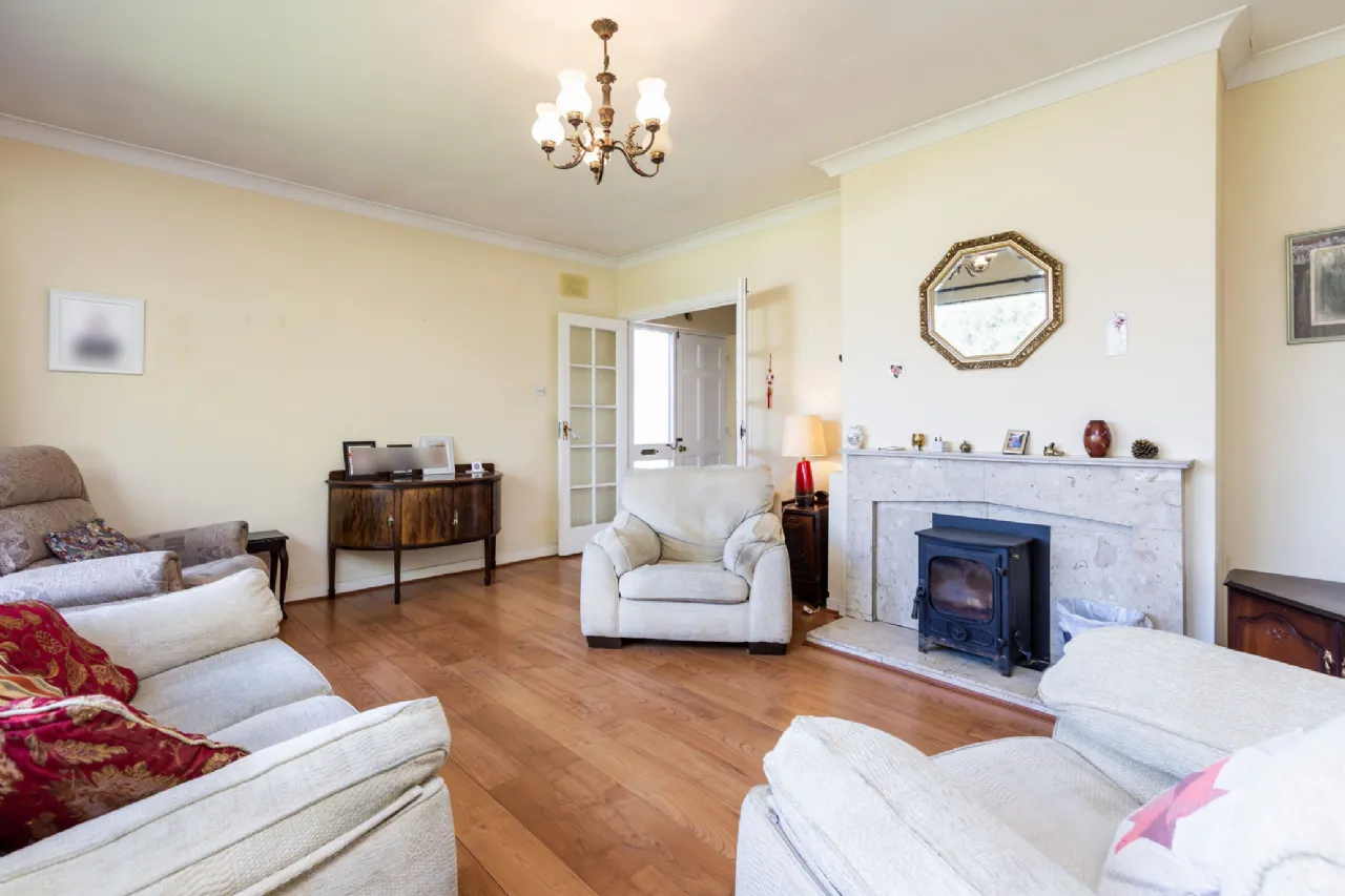Living Room 5m x 4.3m with laminate flooring, stove in marble surround, large front-facing window
