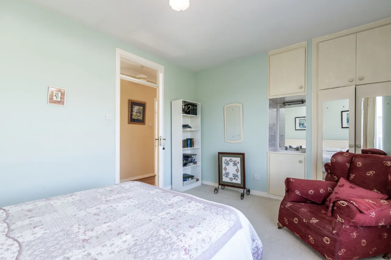 Bedroom 1 4.9m x 3.4m with front-facing window, carpet flooring, WHB built into storage area