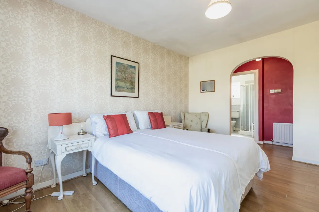 Bedroom 2 En-suite 4.6m x 3.8m with laminate flooring and front-facing window. Arched entrance into wardrobe area and en-suite