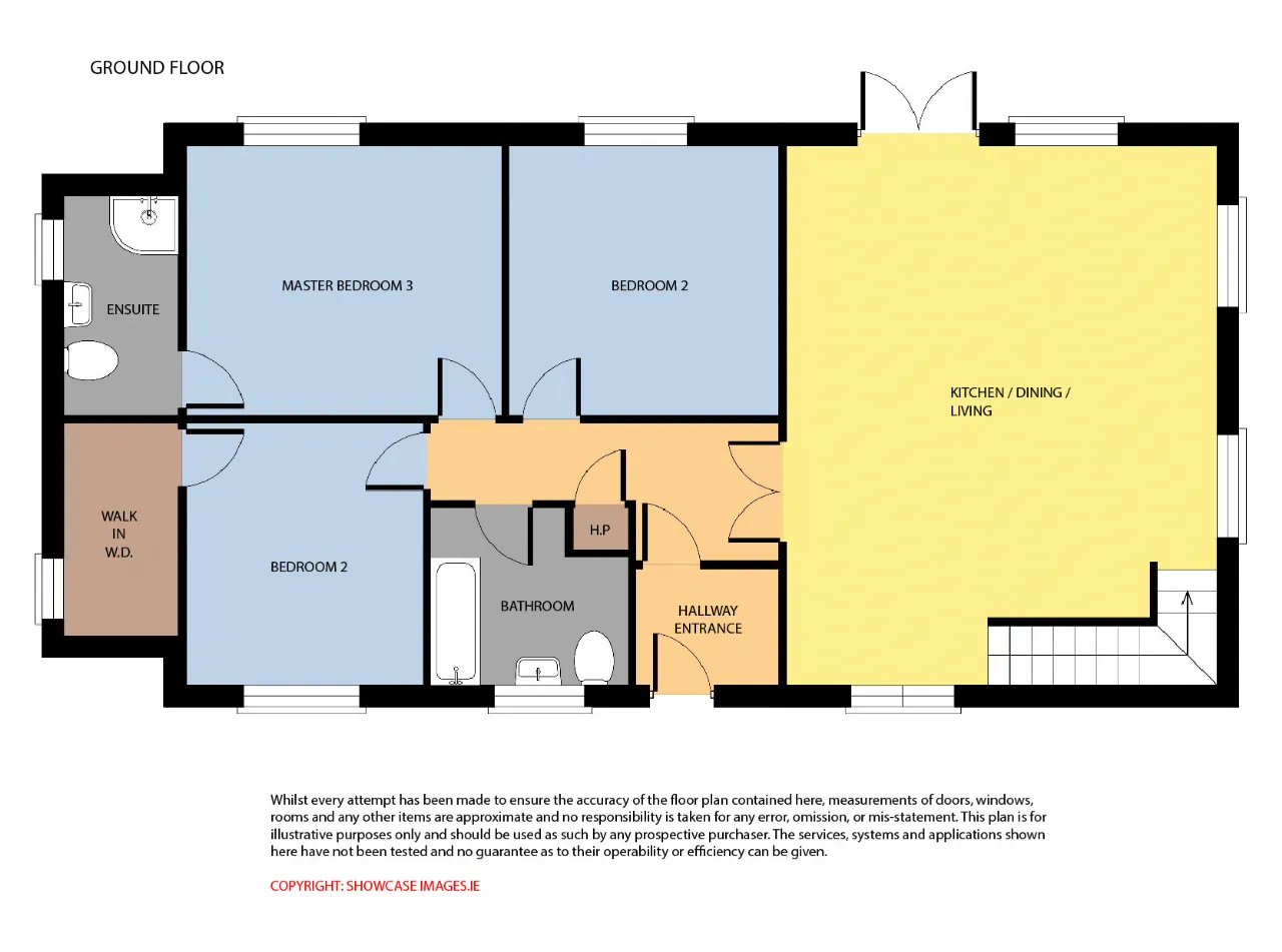 Kitchen / Living / Dining Room 7.61m x 6.17m Kitchen: timber flooring, tiled backsplash, fitted kitchen units, dishwasher, electric oven and hob, integrated fridge freezer and dishwasher. Living/Dining area: laminate wood flooring, feature flame effect electric fire, TV point, double height ceilings and glass inlay double doors to rear deck.