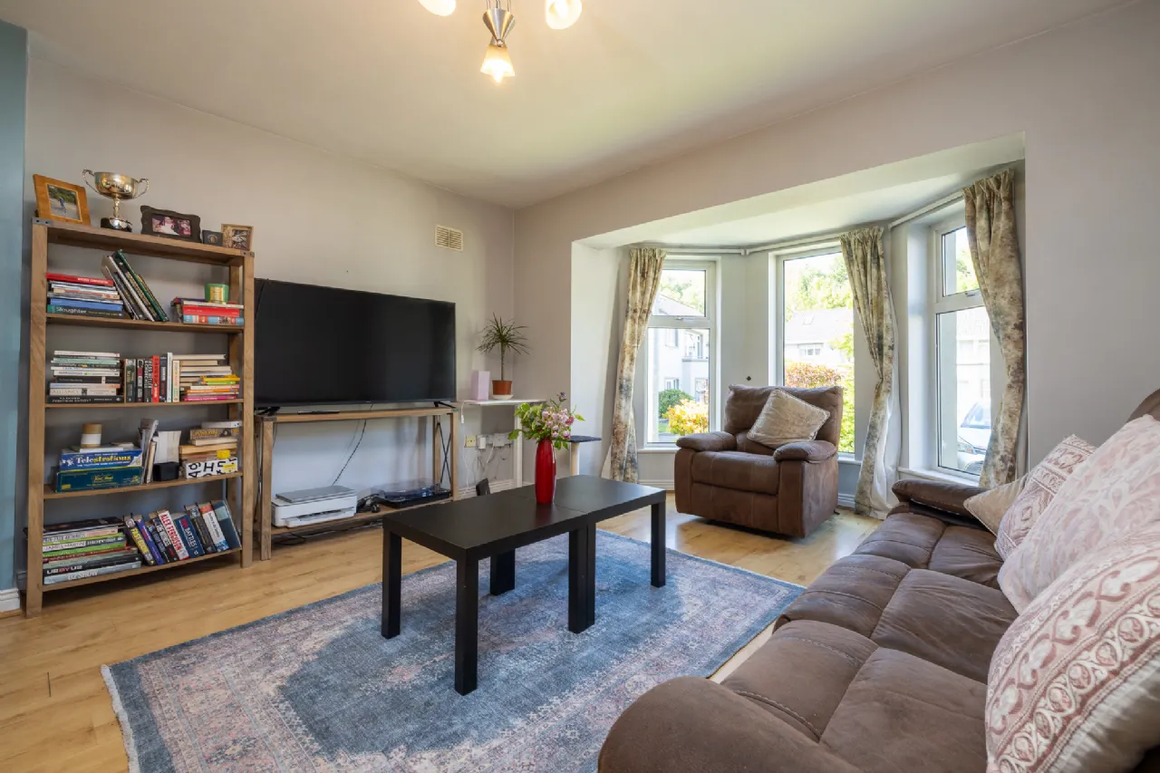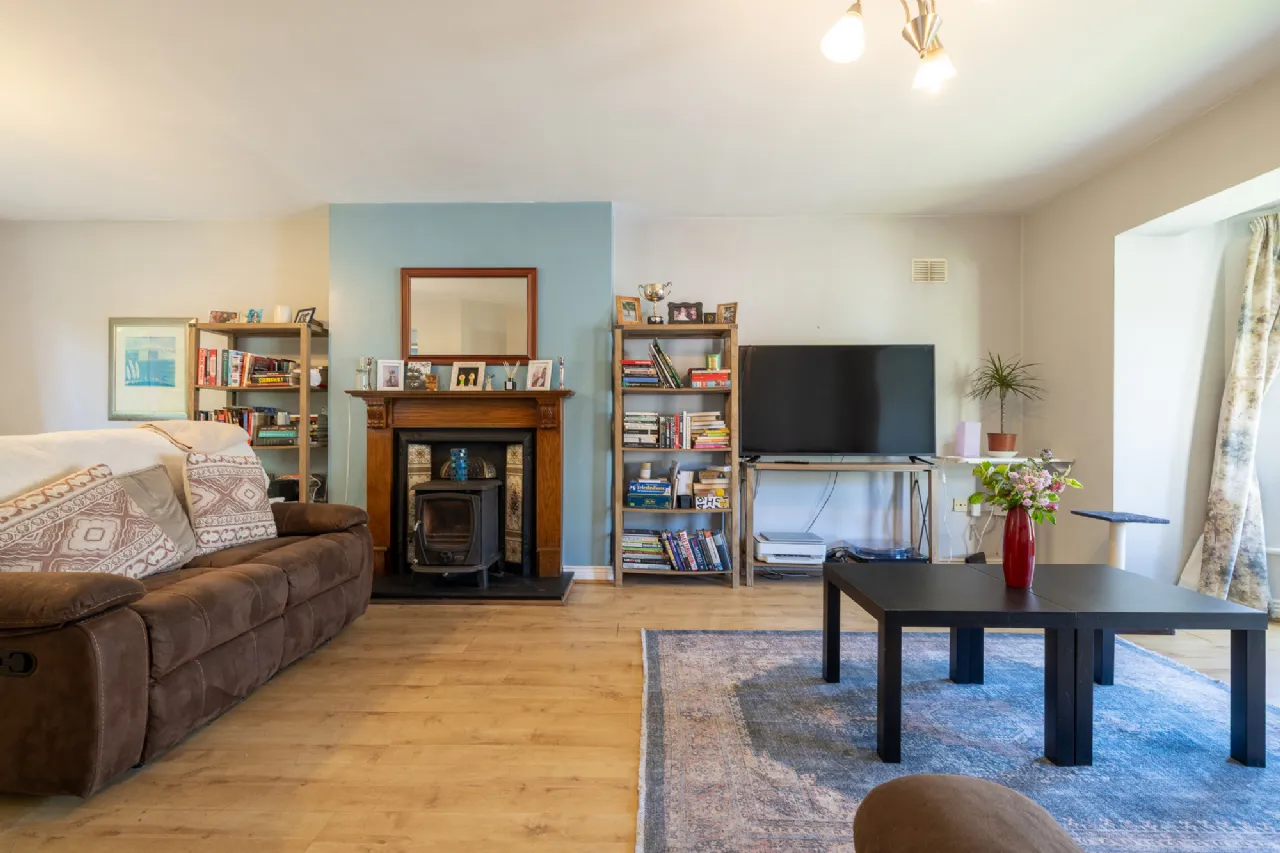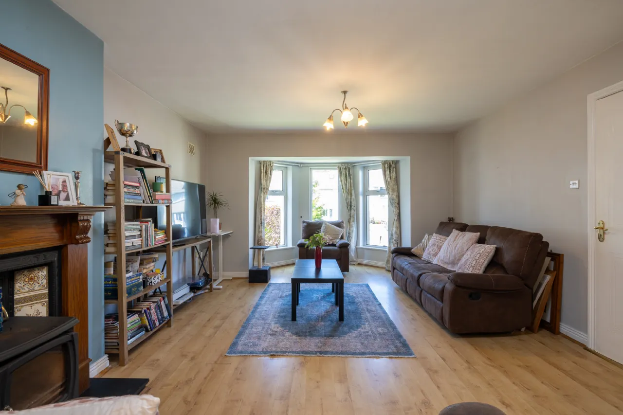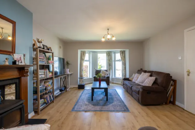 Dining/Sitting Room 9.07m x 4.27m at widest point, laminate wood flooring, feature fireplace with solid fuel stove, sliding door to rear garden and feature bay window.