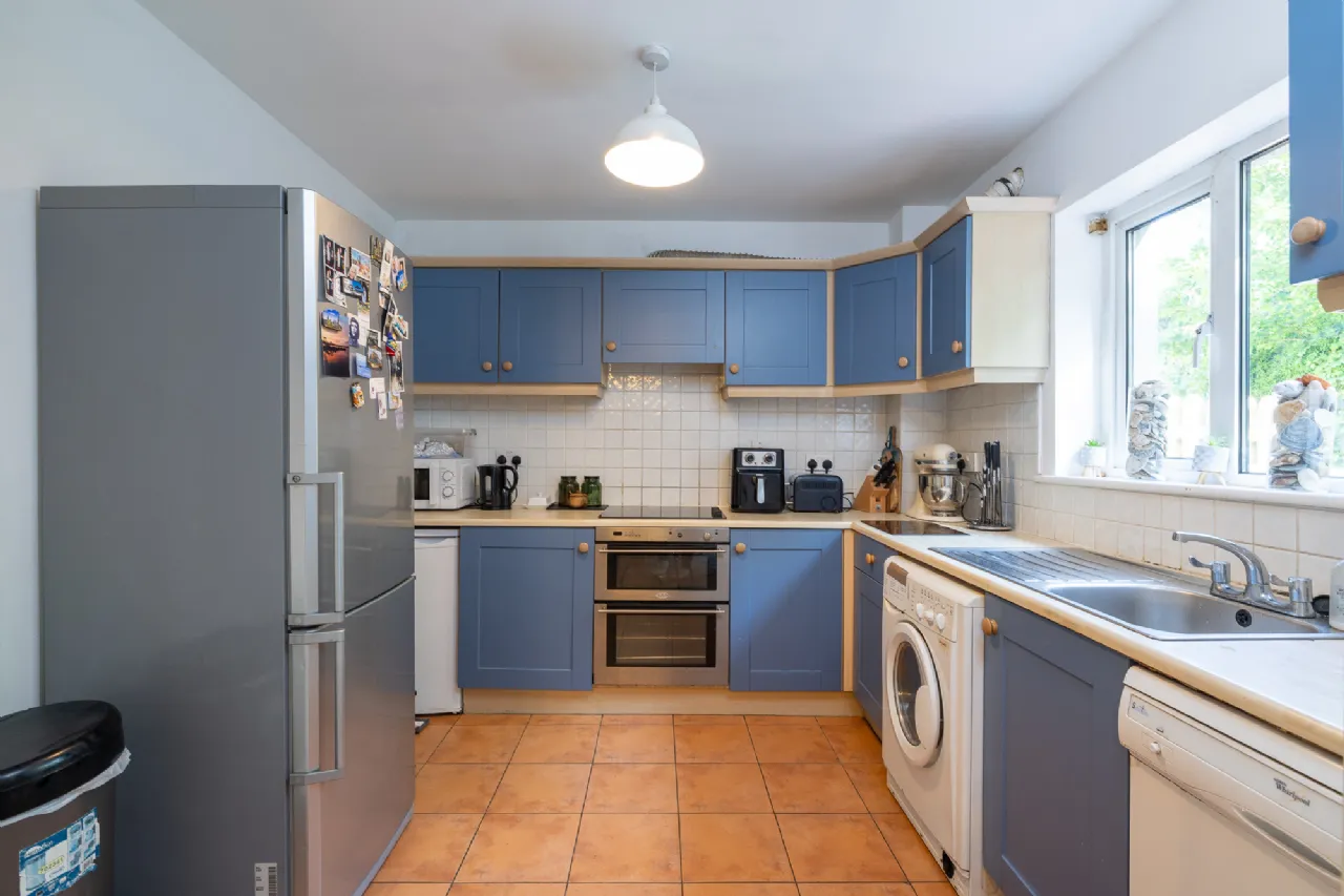 Kitchen 2.97m x 2.86m at widest point, tiled flooring and backsplash, fitted kitchen units, electric oven, electric hob, dishwasher, washing machine and fridge freezer.