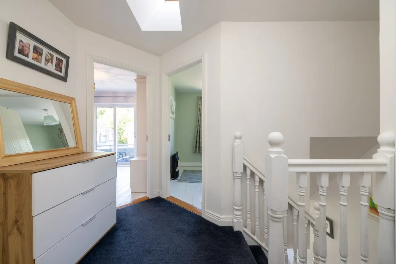 Landing 3.01m x 3.80m at widest point, carpet flooring.