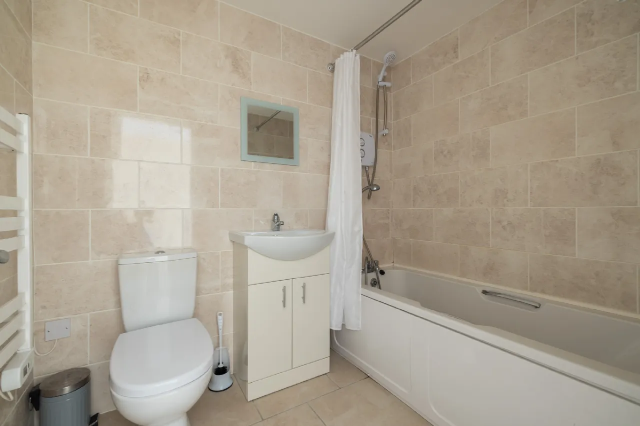 Bathroom 2.23m x 1.68m Modern filled room with tile flooring and walls, bath with electric shower over, WC, wash hand basin.