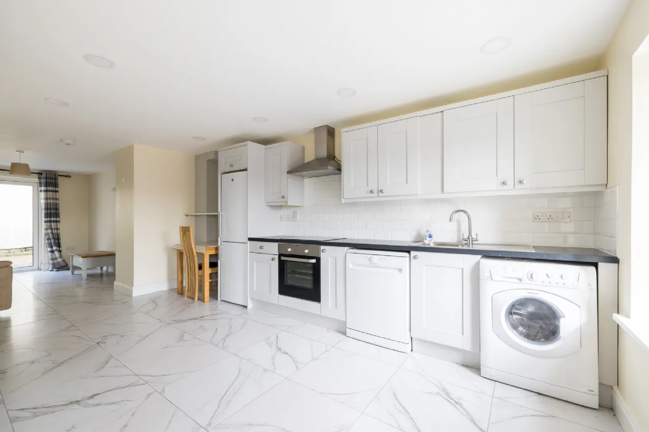 Kitchen/Dining Area 4.97m x 3.85m at widest point With tile flooring and backsplash, fitted kitchen units, electric oven, electric hob, fridge freezer, washing machine, recessed lighting.