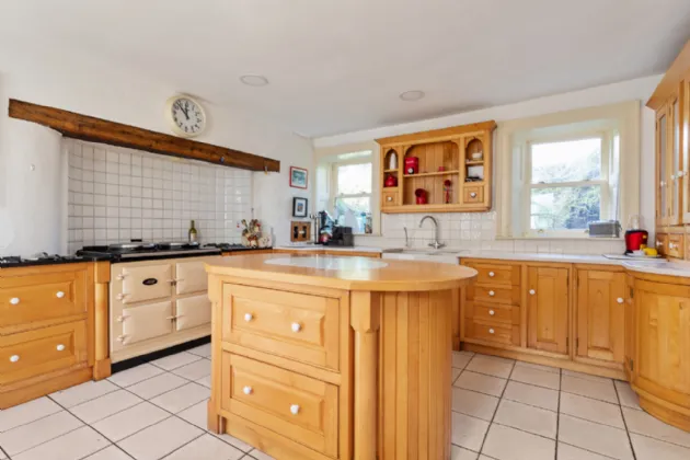 The stairs continue down to the basement, where you will find the kitchen. This traditional space features wooden cabinets, an island unit, a double Belfast sink, a gas hob, and a classic Aga. A door from the kitchen leads out to a walled garden at the side of the house. The basement also includes a couple of small rooms, ideal for storage or various other uses.