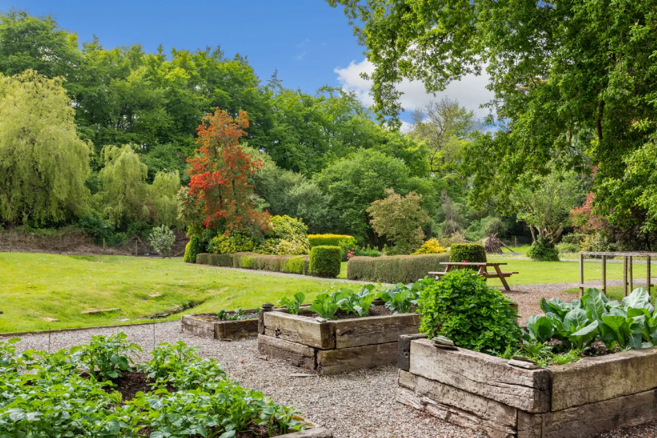 As you arrive, you are greeted by a large gravel forecourt that seamlessly transitions into a sprawling lawn, bordered by mature trees and shrubs. To the side and rear of the house, an enclosed walled garden provides a tranquil retreat, with neatly maintained lawns separated by meandering gravel paths. The garden is adorned with a variety of plants and shrubs and features a dedicated area with raised beds sewn with a wide range of vegetables, complemented by a greenhouse and a nearby garden tool shed.