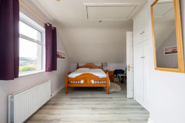 Master Bedroom 4.58m x 3.81m at widest point. laminate wood flooring, inbuilt wardrobes