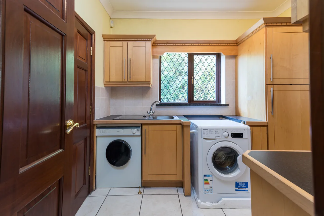 Utility Room 2.38m x 2.86m tile flooring and backsplash, fitted storage units, plumbed for washing machine and dryer
